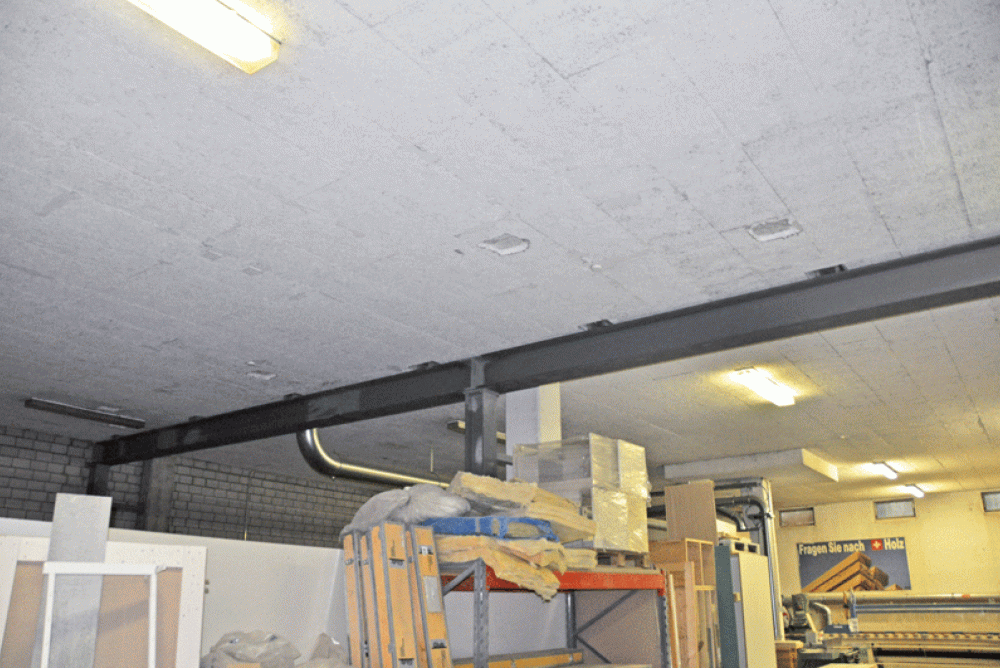sicher zu gehen. Er stellte jedoch fest, dass die Fuge zwischen den Betonplatten zu gross ist und die statischen Eigenschaften negativ beeinflusst. Dabei spielte aber laut Lukas Vatter nicht nur das Maschinengewicht eine Rolle: «Schwer abzuschätzen waren die dynamischen Belastungen und Vibrationen, die während des Betriebes auftreten können.» Aus diesen Gründen musste die Kellerdecke zusätzlich mit einem Stahlträger stabilisiert werden. «Alleine der Träger war schon ziemlich teuer», merkt Vatter an. Für den Einbau benötigte man zusätzlich mehrere hydraulische Stützen, um den Boden ein wenig anzuheben.