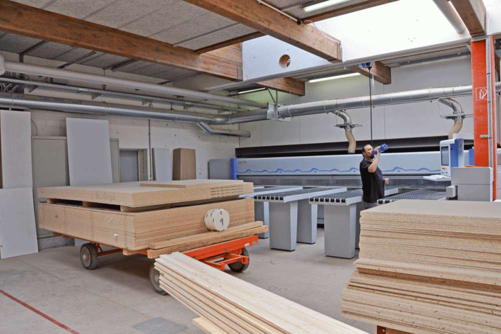 «Im Verhältnis zu den Fixkosten generierten wir zu wenig Umsatz», erzählt Lukas Vatter, Abteilungsleiter der Schreinerei. Eine Analyse zeigte, dass die Arbeitsabläufe an den Maschinen zu ineffizient waren. Dies lag insbesondere am Layout, die Wege zwischen den Maschinen waren schlicht zu lang und umständlich. Das Unternehmen entschied sich deshalb für eine radikale Veränderung: Sämtliche Maschinen für das Kerngeschäft wurden im Maschinenraum im Erdgeschoss zusammengefasst und komplett neu angeordnet. «Die Maschinen für die Massivholzbearbeitung platzierten wir neu im Keller, da wir mehrheitlich Plattenmaterialien für Schränke, Türen und Sturzbretter verarbeiten», ergänzt Vatter. Gleichzeitig investierte die Schreinerei in den Ersatz des bestehenden Bearbeitungszentrums und in eine neue, liegende Plattensäge.