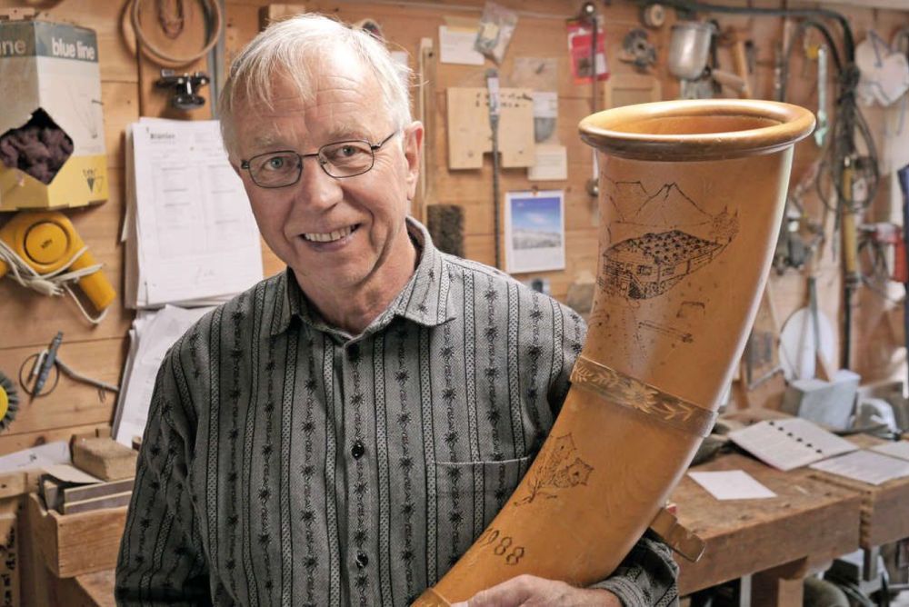 Schreiner Johannes Schranz (69) baut schon über sein halbes Leben lang Alphörner. Bild: Tobias Kilchör