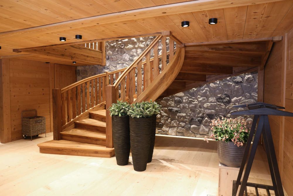 In Zusammenarbeit mit dem verantwortlichen Architekturbüro Roger Bechtiger in St. Gallen konnte nun die eigentliche Planung erfolgen. Ziel war eine halbgewendelte Treppe – also ein u-förmiger Grundriss – mit geschwungener Innenwange. Und obwohl die Treppe vor einer Natursteinwand geplant war, sollte sie freistehend ausgeführt werden. Somit wirkt der Raum noch etwas grösser, und der Handlauf hat auf beiden Seiten die gleiche Optik. Dies und der Umstand, dass die Antrittspfosten erst nach der Antrittsstufe kommen, unterstützt den gesamten Aufstieg in seiner grosszügigen, geschwungenen Wirkung. Der obere Abschluss mit einer Austrittsstufe bestätigt dies noch. Im oberen Stock läuft das Treppengeländer als Brüstung weiter und umfasst auf drei Seiten das etwas grössere Treppenauge. Da die Wände, Decken und Böden aus Holz sind, wird die Steinwand hinter der Treppe betont und schafft optisch räumliche Höhe. Der Schwung des freistehenden Treppenobjektes verbindet dynamisch die Stockwerke.