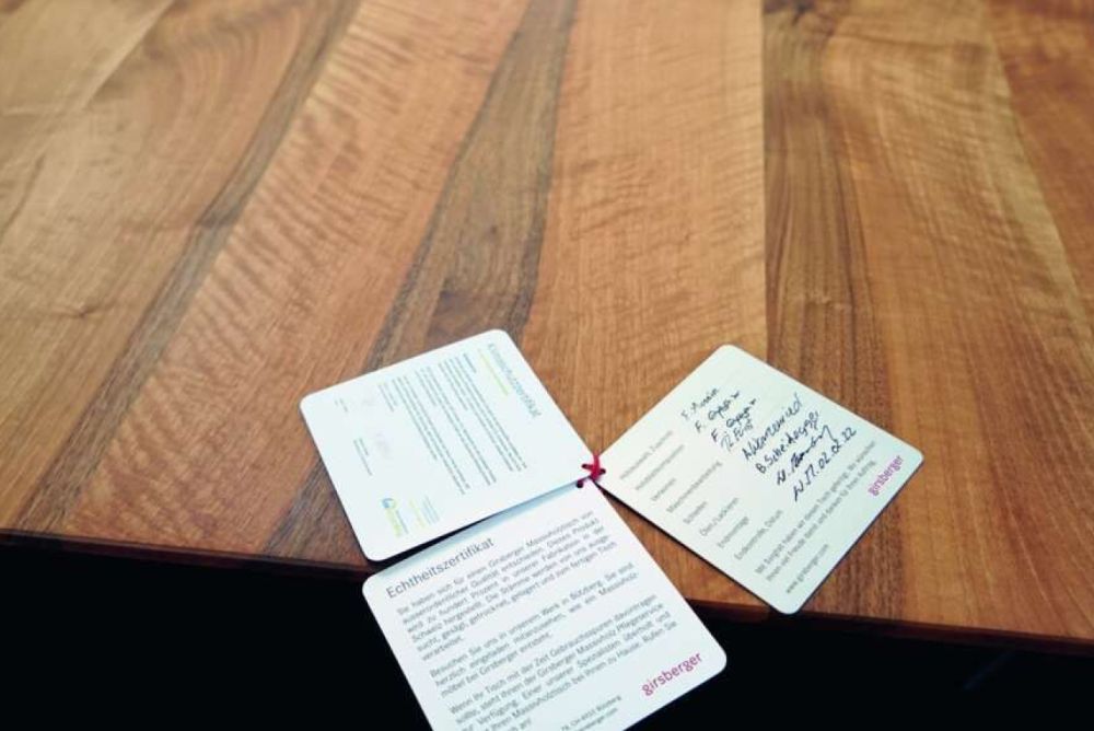 Natürlich zeigte der Hersteller sein Tisch-Auszugsystem mit der auch über die Einlage laufenden Maserung der massiven Tischplatte. Eine besonders lange, ungeteilte Tischplatte aus Kernesche wurde mit dem neuen Betonfuss Henry präsentiert.
