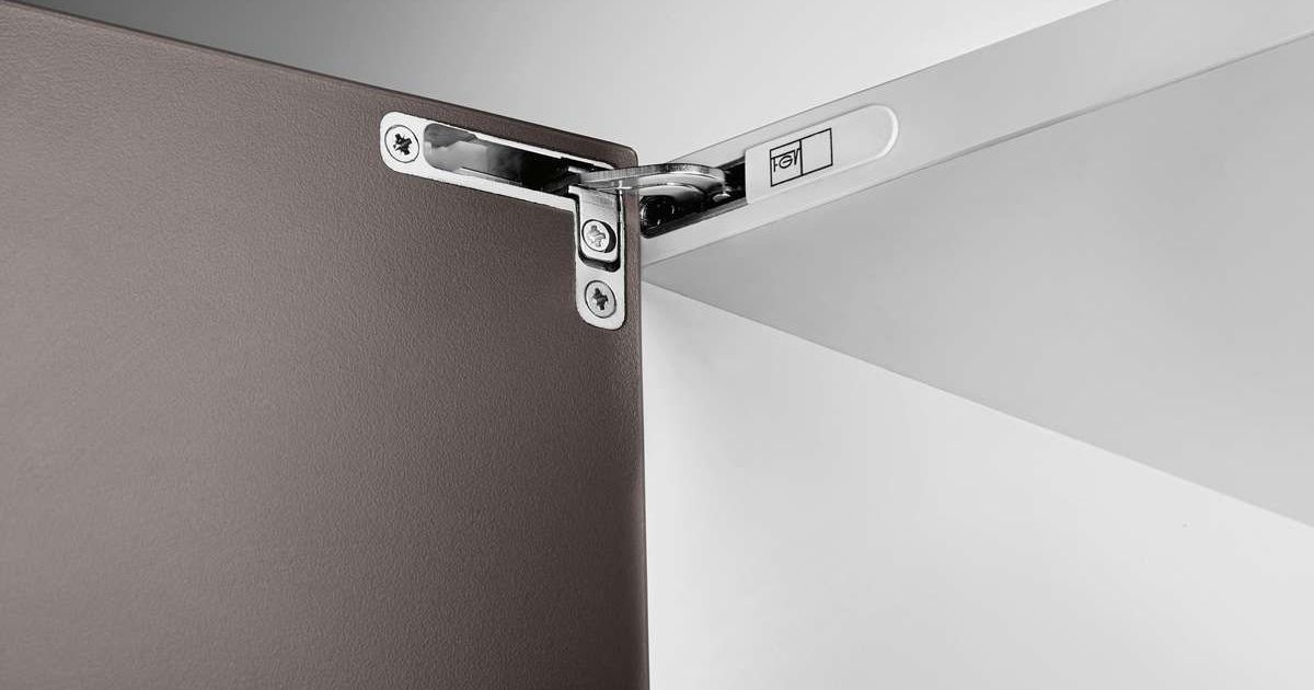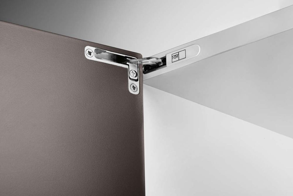 Mindestens 20 mm Materialstärke sind beim Korpus nötig, dann lassen sich die neuen Eckscharniere «Libera» von FGV verwenden. Im Angebot sind verschiedene Designs in der XL-Variante für Türen mit einem Gewicht von bis zu 30 Kilogramm. Damit hat auch FGV ganz neu ein Eckscharnier im Programm, das für ungestörte Optik im Inneren des Korpus sorgt. Ein gedämpfter Schliessvorgang und auch grifflose Fronten mit der «Push to open»-Funktion sind auf Wunsch integriert. Das Band ist dreidimensional bis zu zwei Millimeter in jede Richtung einstellbar und sorgt für einen Öffnungswinkel der Tür von 105 Grad. Die nötige Stärke der Front bei Holztüren beträgt mindestens 18 Millimeter.