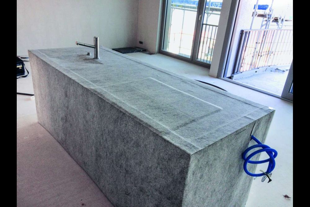 Wie eine zweite Haut passt sich das Abdeckvlies an die Form der Kücheninsel an und schützt diese. Bild: Fritz Landolt AG