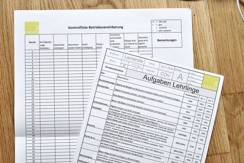 Es beginnt bei der internen Kommunikation: «Dabei handelt es sich um die Rahmenbedingungen im Unternehmen, sprich die Betriebsvereinbarungen oder den Ämtliplan», erklärt Virgile. «Den Ämtliplan baue ich kontinuierlich aus und teile die Aufgaben uns Lernenden zu.» Ob alles ordnungsgemäss erledigt werde, überwache der Werkstattchef, erzählt der junge Oltner. «Bei der externen Kommunikation geht es darum, junge Leute auf den Schreinerberuf aufmerksam zu machen», übernimmt David das Wort. Dafür publizieren die Lernenden Bilder und Texte auf der Firmenwebsite. Firmenprofile für Facebook und Instagram sind auch in Planung. Momentan wird fleissig recherchiert, wie sich die Schreinerei in den neuen Medien präsentieren kann. Auch die Vorbereitung auf das Standby-Interview gehörte in Davids Bereich. Dafür hat er einen Ablaufplan und eine Dokumentation der Bereiche zur Abgabe erstellt.