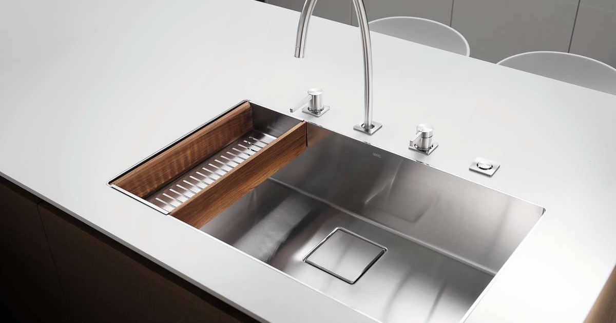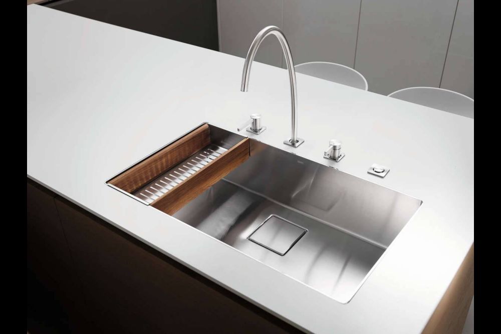 Elegant und schlank definiert «KWC ERA» von Franke einen anderen Stil als bisher gewohnt – ganz im Sinne von «weniger ist mehr». Zeitloses Design in Edelstahl, pures Material in perfektem Finish und Feinheit prägen diese Armaturenlinie von KWC. In vier Auslaufvarianten gehen die Hebelmischer auf die individuellen Stilvorlieben, Arbeitsweisen und Nutzungsgewohnheiten ein. Analog zum Design- und Materialkonzept der Armatur macht die Spüle «KWC ERA» das Spül- und Rüstzentrum zur gut ausgestatteten Werkstatt mit passendem Zubehör. Denn bei aller Automatisierung des Kochgeschehens ist beim Spülen und Rüsten noch immer echte Handarbeit angesagt.