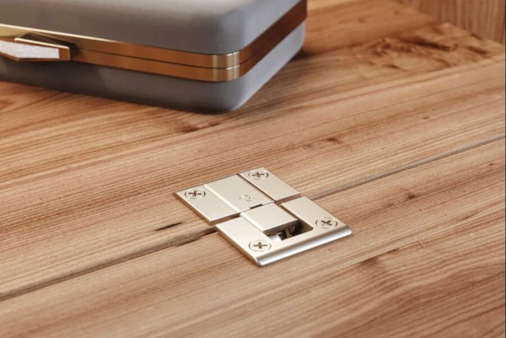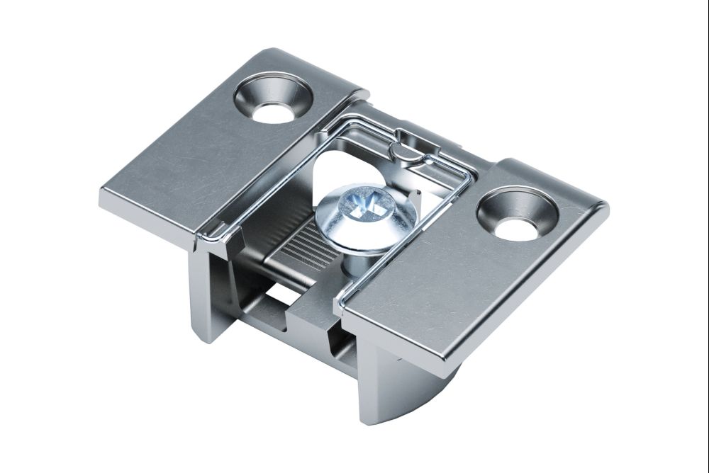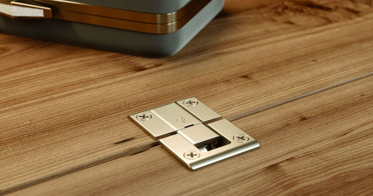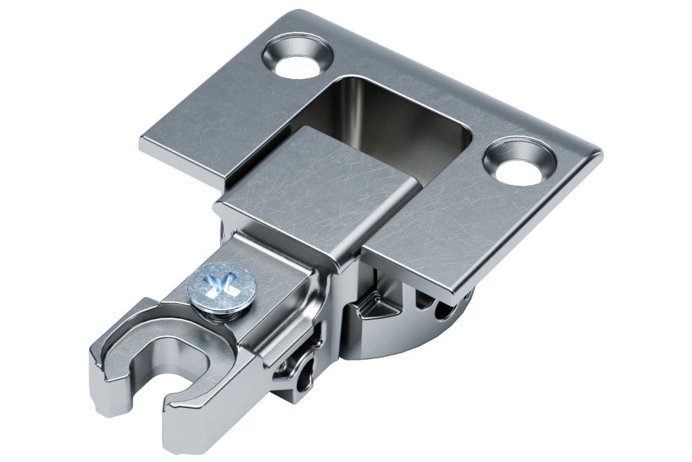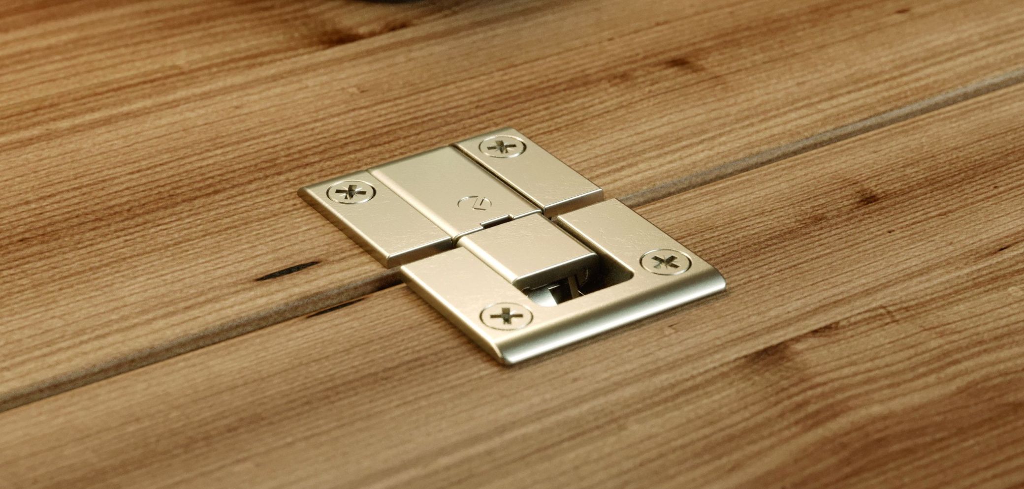 Das Klappenband «Kimana» von Italiana Ferramenta ist ein flaches Scharnier für nach oben oder unten öffnende Klappen. Das Öffnen und Schliessen der Klappe ist selbst dann möglich, wenn der Boden des Möbels auf einer Platte aufliegt oder auf dem Korpusdeckel ein Zier- oder Beleuchtungselement verbaut ist. Das Klappenband benötigt eine Topfbohrung von 26 mm Durchmesser und 14 mm Tiefe beziehungsweise 15 mm Tiefe bei der Front. Befestigt wird das Band mit je zwei Befestigungsschrauben pro Seite, und über die unter der Abdeckung verborgenen Schrauben (PZ2) kann es dreidimensional justiert werden.