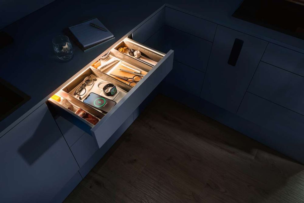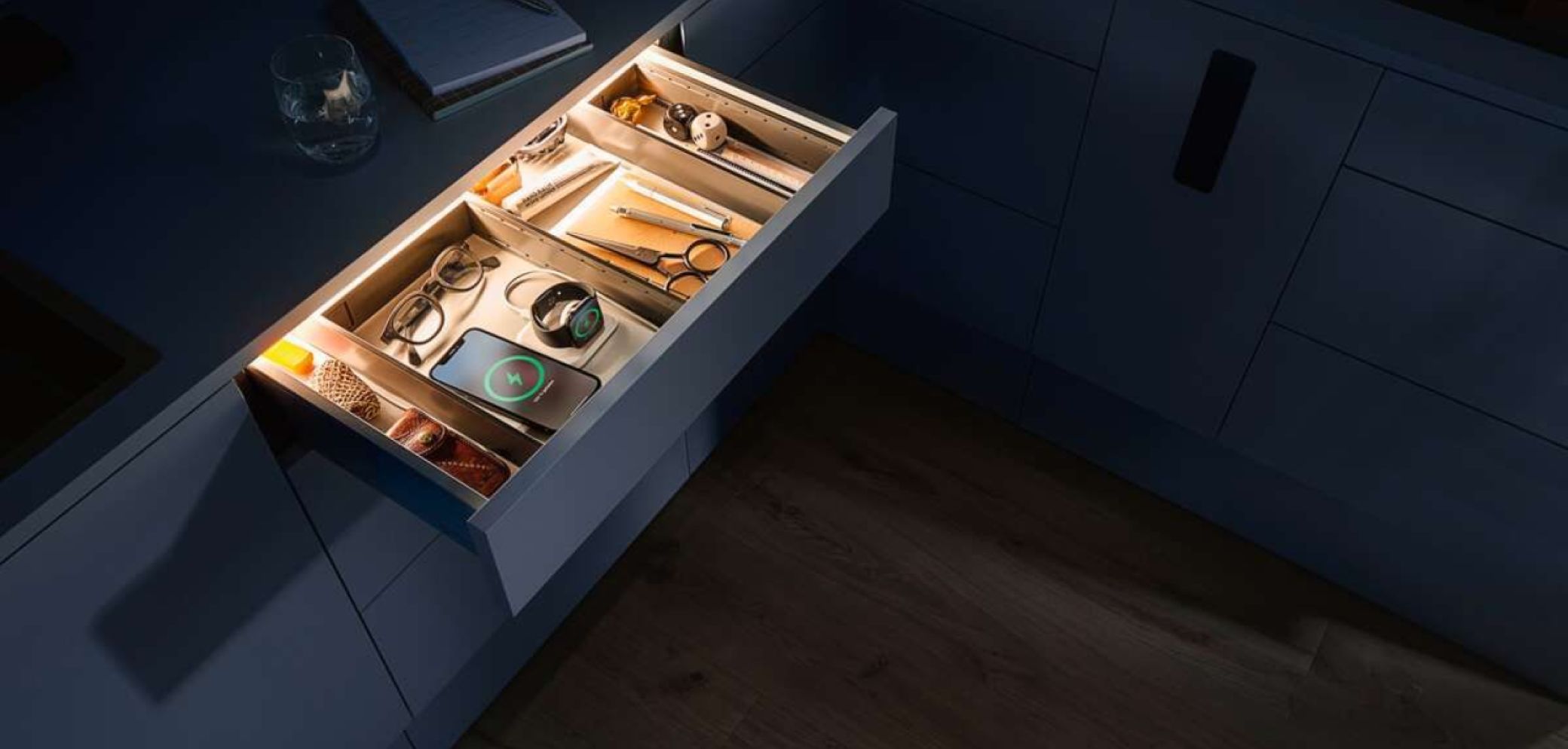 «Amperos DC» ist eine 24-V-Infrastruktur, die ganze Unterschränke mit Strom ver- sorgt. Dabei lassen sich die Schubladen komfortabel ein- und aushängen, ohne Kabel zu lösen. Die Lösung bringt Licht in Schubladen und bietet auch eine Lademöglichkeit mittels USB-C-Anschluss. Die zukunftstaugliche Schnittstelle ermöglicht, elektronische Geräte am selben Ort aufzubewahren und gleichzeitig zu laden. Eine Stromschiene an der Rückseite des Korpus macht umständliches Kabelverlegen oder Wechseln von Batterien überflüssig. Mittels App lassen sich die USB-Ports und die Beleuchtung in Betrieb nehmen und steuern.