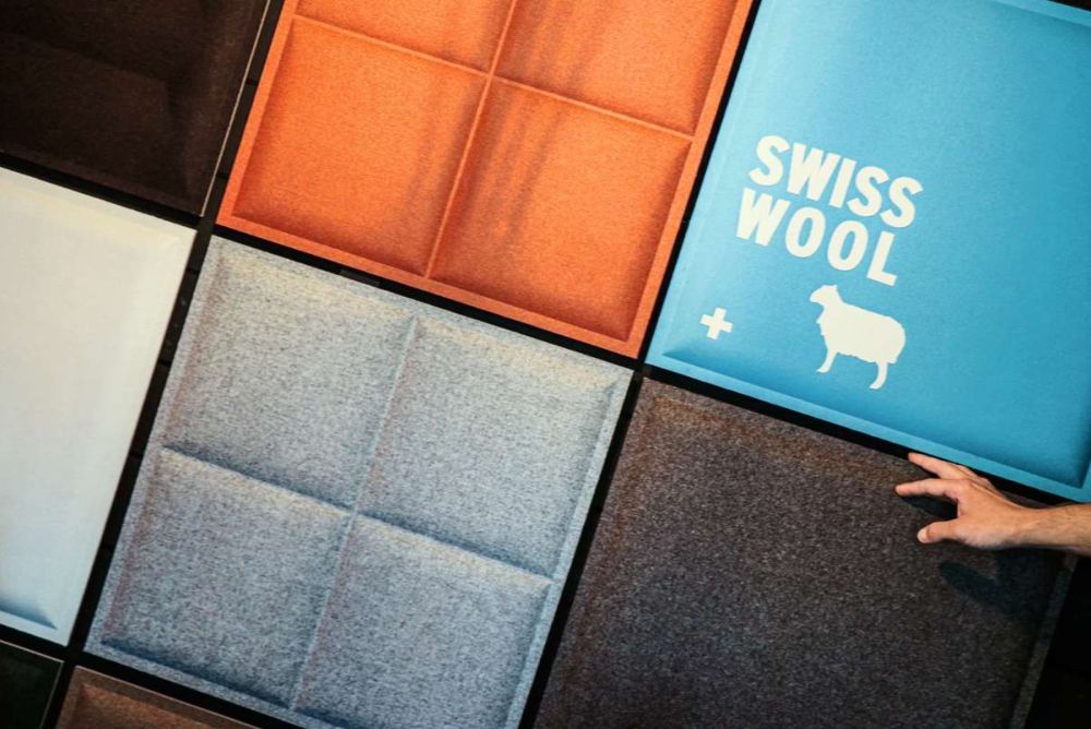 So schluckt die Oberfläche der Wollfaser den Schall über ein breites Frequenzspektrum. Und die Paneele bringen durch ihre warme Oberfläche zusätzliche Gemütlichkeit in den Raum. Die Wolle stammt aus dem «Swisswool»-System, das jährlich gegen 300 Tonnen Schafschurwolle an rund 20 Orten in der Schweiz sammelt und möglichst regional verarbeitet.