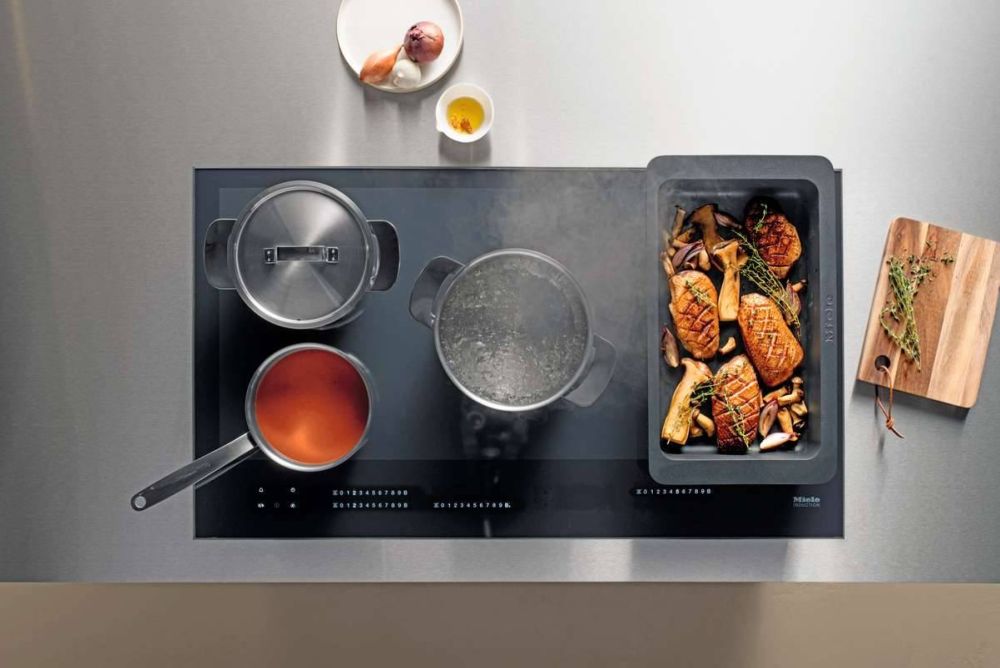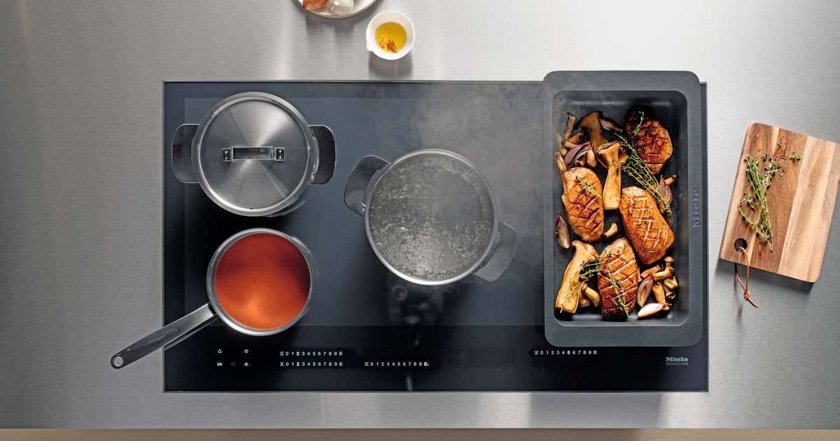 Bis zu sechs Pfannen passen auf das Voll-flächen-Induktions-kochfeld von Miele. Bild: Miele