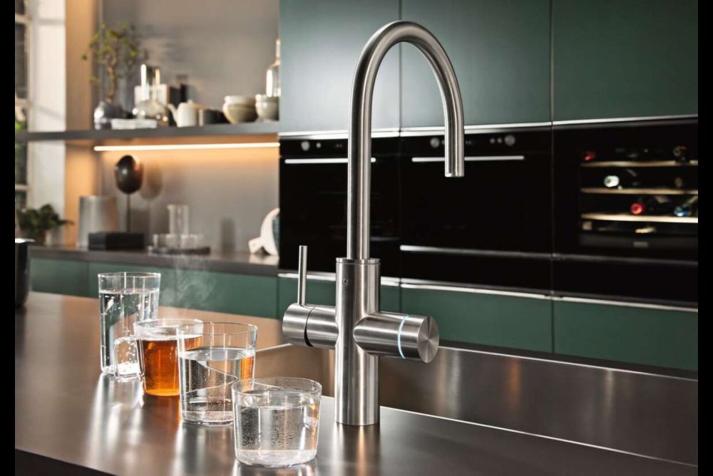 Franke hat mit «Mythos Water Hub» ein System auf den Markt gebracht, das sämtliche Wünsche erfüllen soll: Neben klassischem Leitungswasser liefert die Armatur sofort kochendes, gekühltes, raumtemperiertes und sprudelndes Wasser auf Knopfdruck. Das System vereint viele Einzelgeräte und schafft so Ordnung und Platz auf der Arbeitsfläche. Selbst der Unterschrank wirkt aufgeräumt, da nur eine kompakte Box für alle Anwendungen installiert wird. Der leistungsstarke Filter garantiert laut Firmenangaben einen gesunden Wassergenuss, und die handelsüblichen CO2-Kartuschen tauscht man im Supermarkt. Die Installation soll ein- fach und schnell gelingen, mit nur einem Anschluss. Die kompakte One-Box-Lösung ist 200 mm breit und 440 mm hoch und beinhaltet unter anderem einen 4 l gros-sen Boiler sowie einen 2,2 l fassenden Kühltank. Der fünfstufige Filter ent- fernt Partikel und organische Verunreinigungen, zudem Mikroplastik, Chlor, Hormone, Medikamentenrückstände, und neutralisiert unangenehme Gerüche. Ein integrierter Ionentauscher reduziert die Wasserhärte und verhindert damit Kalkablagerungen, zudem filtert er giftige Schwermetalle heraus. Dank einer spe- ziellen Mineralienstabilisierung sollen wertvolle Komponenten wie Magnesium und Kalzium erhalten bleiben.