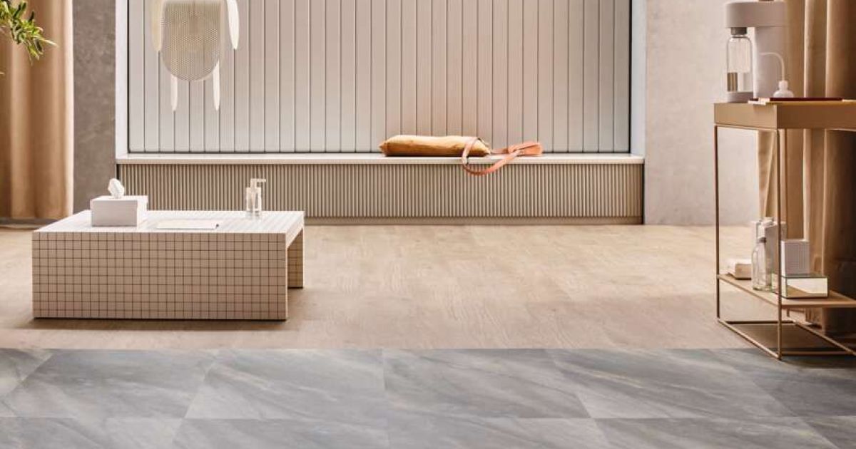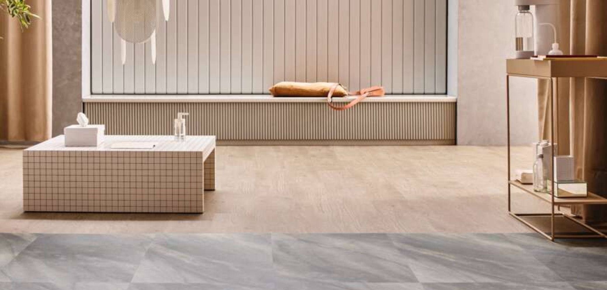 In Kombination mit Holz bieten Stein-, Fliesen- oder Beton-dekore spannende Möglichkeiten der Gestaltung. Bild: Forbo