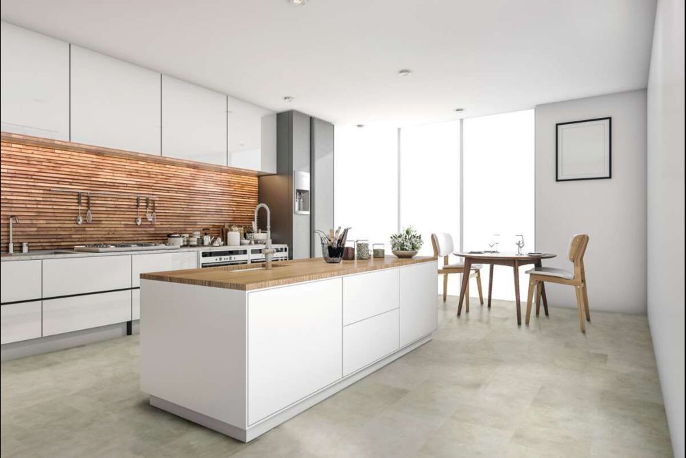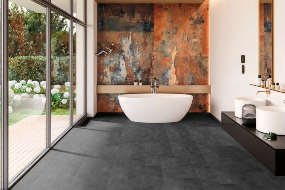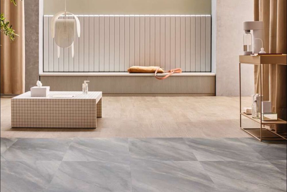 Gerade mineralische Optiken wie Schiefer, Travertin oder Beton machen Designvinylböden zu einer sinnvollen Ergänzung des bestehenden Sortiments. Während Holzdekore schnell in Konkurrenz zu Parkett oder Laminat stehen, bedienen Stein- und Betonoptiken eine völlig andere gestalterische Richtung. Sie wirken kühl, strukturiert und modern und passen ideal zu urbanen Interiors, offenen Grundrissen und klaren, minimalistisch gestalteten Räumen. Kunden, die bewusst andere Materialien als Holz wünschen, finden in diesen Dekoren oft eine überzeugende Alternative zu echten Keramik- oder Steinfliesen. Zudem bieten sie den Vorteil einer warmen Oberfläche, geringerer Rutschgefahr, einer deutlich angenehmeren Akustik und eines erheblich reduzierten Verlegeaufwands. Besonders für Badezimmer, Küchen, Keller, Eingangsbereiche und Gewerbeflächen, also Räume, in denen Holz naturgemäss weniger geeignet ist, spielen Vinylbeläge ihre Stärken aus.
