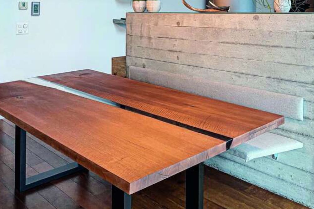Ich habe einen Tisch aus Nussbaum hergestellt. Das Holz hatte ich selbst ausgesucht. Es hatte eine Weile gedauert, bis ich zwei passende Bretter fand, denn ich wollte die Bretter mithilfe von Epoxidharz verbinden. Das Epoxidharz habe ich danach mit Hochglanz lackiert, und das Nussbaumholz ist geölt. Die Tischbeine sind aus Ahorn und wurden schwarz gespritzt, damit ein Eisenlook entstand. Ein Grossteil der Arbeit bestand aus Schleifen. Insgesamt habe ich rund 100 Stunden ins Projekt investiert.