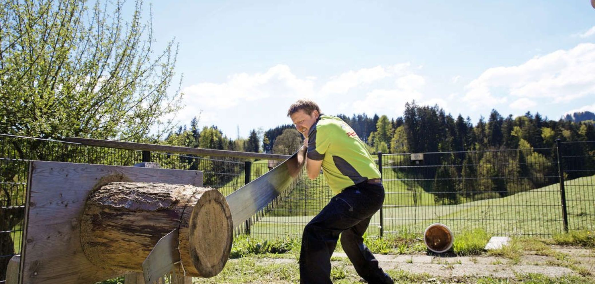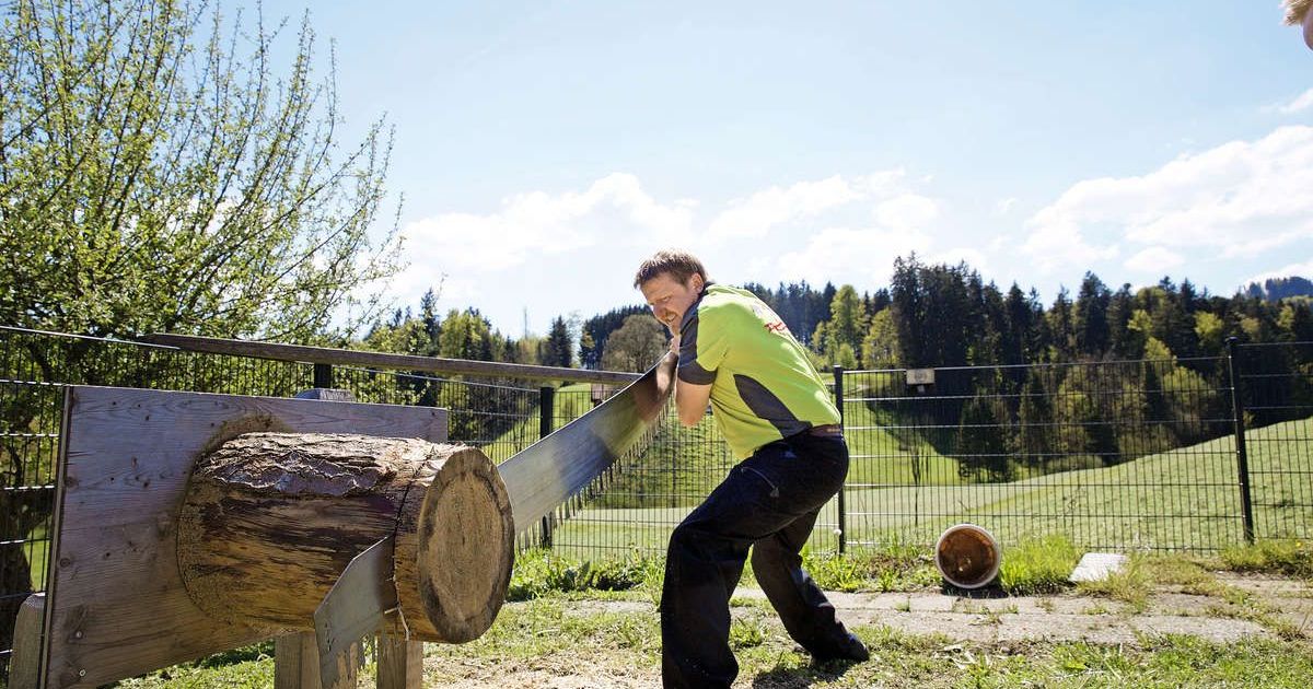 Das Sonnenlicht spiegelt sich im Gold der kleinen Axt, die im linken Ohr von Albert Kläger steckt. Ein weit grösseres Exemplar hält er in beiden Händen. Jetzt tritt er einen Schritt zurück, der ganze Körper angespannt wie eine Sprungfeder. Holt mit den Armen weit aus, lässt sie dann nach vorne schnellen, und schon kracht die Axt in den aufgestellten Stammteil. Splitter fliegen, Holzteilchen spicken auf alle Seiten, Kläger holt ein zweites, drittes, viertes Mal aus, die Axt donnert ins Holz, dann wechselt er die Seite, und ehe die Zuschauerin begreift, was geschieht, ist der Stamm von gut und gern 35 Zentimetern Durchmesser entzwei. Was aussieht, als hätte Kläger mal eben ein Holzscheitchen fürs Cheminée gehackt, ist in Wahrheit ein Hochleistungssport, genauer: «Standing Block Chop». Eine von sechs Disziplinen, die an den Schweizer Meisterschaften von Stihl Timbersports ausgetragen werden. Albert Kläger, Zimmermann aus Bütschwil im Toggenburg, zählt zu den Besten seines Fachs: Der Sport-Holzfäller hat sich buchstäblich an die Schweizer Spitze geschlagen und gesägt. Jetzt wischt er die Schweisstropfen von der Stirn und schält bereits den nächsten Stamm, liebevoll «Holzrugel» genannt.