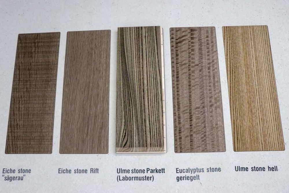 Hört man sich die Namen dieser alternativen Holzarten an, wird schnell klar, dass es sich um keine unbekannten und speziellen Baumarten handelt. Vielmehr ist es eine Wiederentdeckung bekannter Holzarten, die durch natürliche Modifikationen wieder konkurrenzfähig gemacht werden. So erhält der Birnbaum durch eine Räucherung einen dunkleren Charakter, der sich problemlos im aktuellen Trend einsetzen lässt. Geräuchert oder mit der natürlichen Vergrauung «Stone» wird der Eukalyptus zur Holzart mit allerlei Einsatzmöglichkeiten, und auch die Ulme bekommt durch das «Stone»-Verfahren einen neuen Charakter.