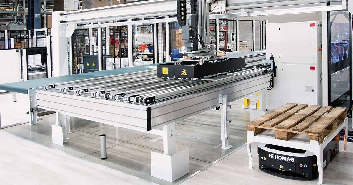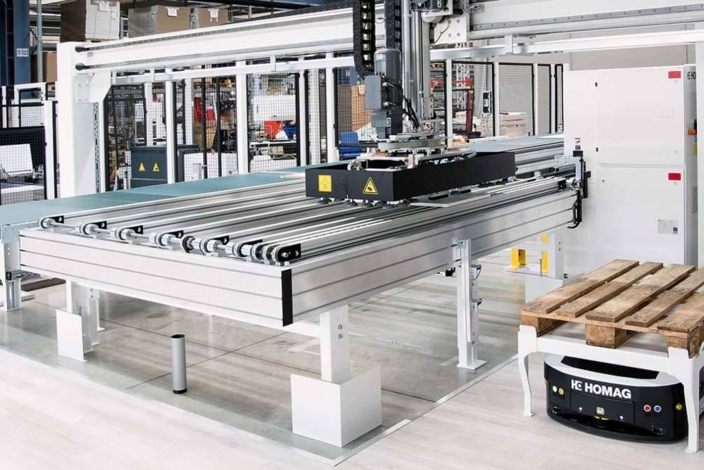 Wer seine Produktion automatisieren will, greift bei der herkömmlichen Verkettung von Einzelmaschinen oder einzelnen Maschinensystemen auf positionsgebundene Transportlösungen wie beispielsweise Rollenbahnen zurück. Das System «Transbot», die fahrerlosen Transportfahrzeuge von Homag, durchbricht diese starre Verkettungslösung. Weil die Fahrzeuge frei beweglich auf ihrem virtuellen Streckennetz im Raum fahren, benötigen sie weder Schienen noch Bodenmarkierungen. Jeder «Transbot» orientiert sich anhand fixer Hallengegebenheiten wie Pfosten, Maschinen oder Wände. Laut Hersteller lässt sich das System im Vergleich zu herkömmlichen Verkettungslösungen nicht nur kostengünstiger, sondern auch unkompliziert implementieren. Eine Anpassung auf geänderte Produktionsprogramm- oder Bearbeitungsreihenfolgen ist leicht zu realisieren.