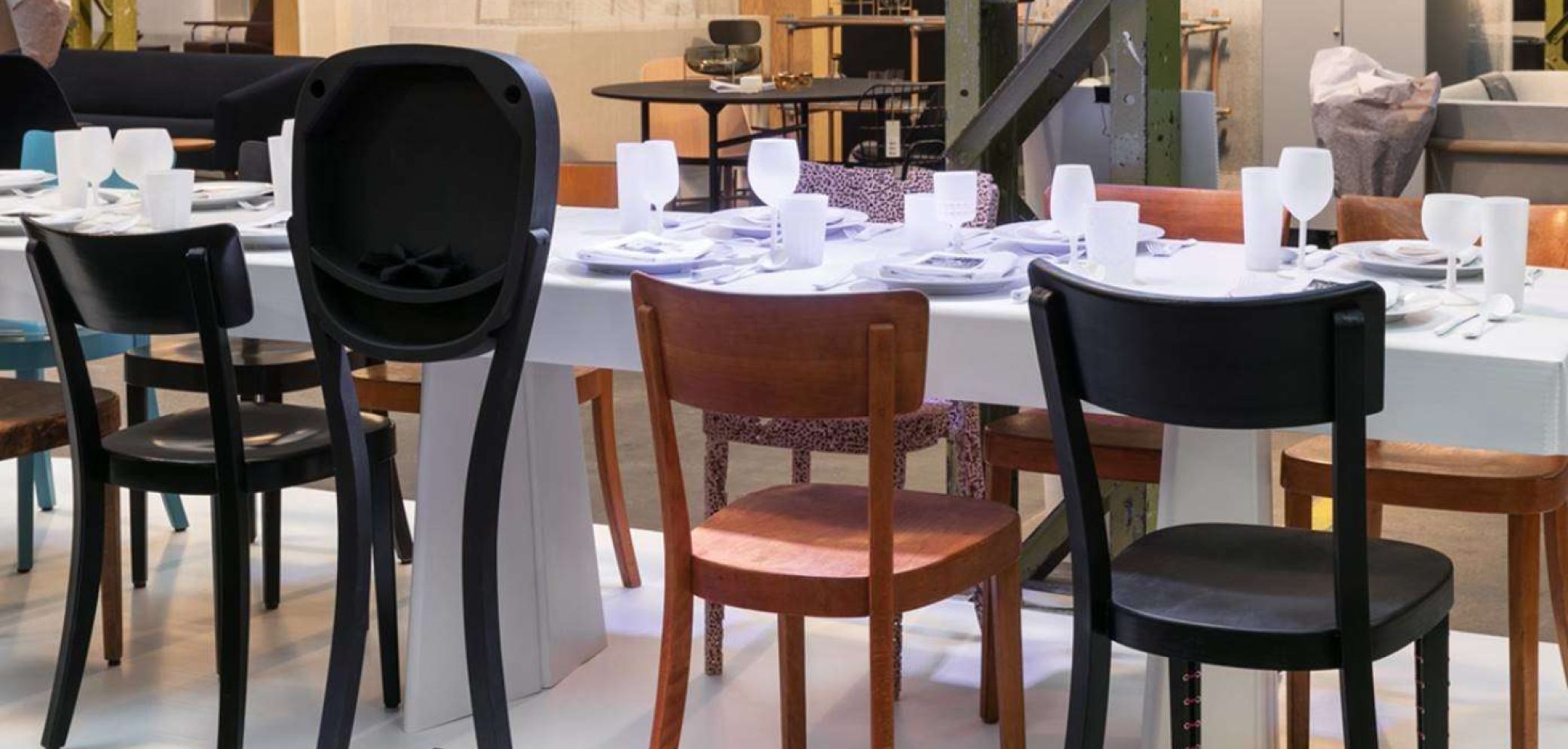 Diese Stuhlreihe an der Designmesse zu bespielen, war die Aufgabe der diesjährigen Einrichtungsgestalter der HFTG. «Wir haben wie bei einem klassischen Projektauftrag die Rahmenbedingungen angeschaut und haben dann diverse Ideen diskutiert», blickt Gabriela Thomann, Teilzeit-Studierende der HFTG zurück. Die Klasse habe sich nach mehreren Phasen der Entscheidungsfindung auf das «Familientreffen» geeinigt. Die neuen Stühle und die Klassiker sollten zusammenkommen wie eine Familie. «Denn letztlich haben alle Stühle die gleiche DNA, den gleichen Designer als Ursprung», erklärt Thomann. Mit dem Familientreffen als Leitidee entstand sodann die Stuhl-Ausstellung entlang einer grossen Tafel, einem festlich gedeckten Tisch.
