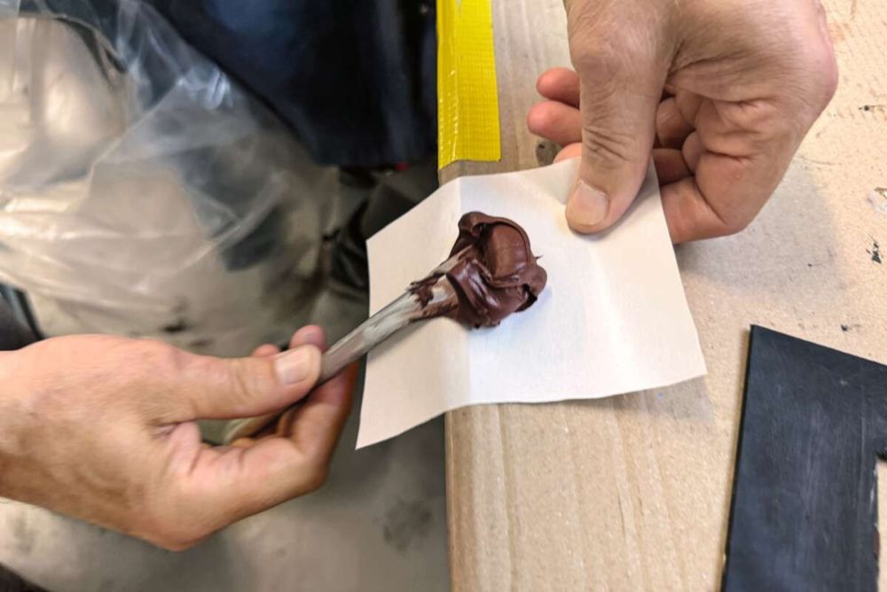 Solche Abfüllanlagen, wie sie in Schwanden oder Kloten stehen, sind für grosse Mengen ausgelegt. «Bei zwei Kartons lohnt es sich nicht, diese auf der Abfüllanlage einzufärben, weil der Ausschuss zu gross ist», sagt Vögele. Dann geht man auf einen Labordissolver (Gerät zum Mischen, Lösen, Rühren), wo man die Farbe mit Monopaste in einem 20-Liter- oder 30-Liter-Gebinde anmischt und in die Kartuschen abfüllt. Eine andere Möglichkeit ist das Einfärben einzelner Kartuschen. Dabei wird transparentes Silikon zusammen mit Farbpigmenten in einem Spindelmischer gemixt. Der Haken daran: Beim Mischen und Abfüllen gerät Luft ins Innere der Kartusche. Je nachdem wie viel, kann der Vulkanisationsprozess des Dichtstoffes ausgelöst werden. «Mit Pigmenten eingefärbte Einzelkartuschen sollte man also relativ schnell brauchen. Solche Kartuschen sollten nicht einfach ein halbes Jahr oder ein Jahr im Lager rumliegen», erklärt Vögele.