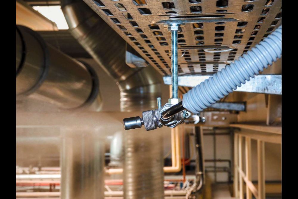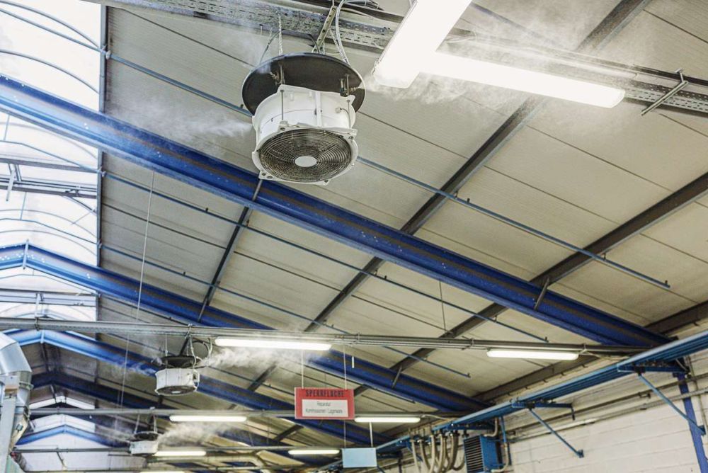 Für die Luftbefeuchtung in Werkhallen verwendet man vor allem zwei Systeme. Beide funktionieren mit Kaltwasser, das vorher mittels einer Wasseraufbereitung filtriert, enthärtet und entkeimt wird. Danach führt man es mit einem druckluftunterstützten System oder einer Hochdruckpumpe mit 50 bis 100 Bar den Zerstäuberdüsen zu. Die entstehenden Wasserwölkchen reinigen zudem die Luft von Staubpartikeln. Eine Steuereinheit kontrolliert in beiden Fällen mittels Sensoren das Erreichen sowie Einhalten der Luftfeuchte.