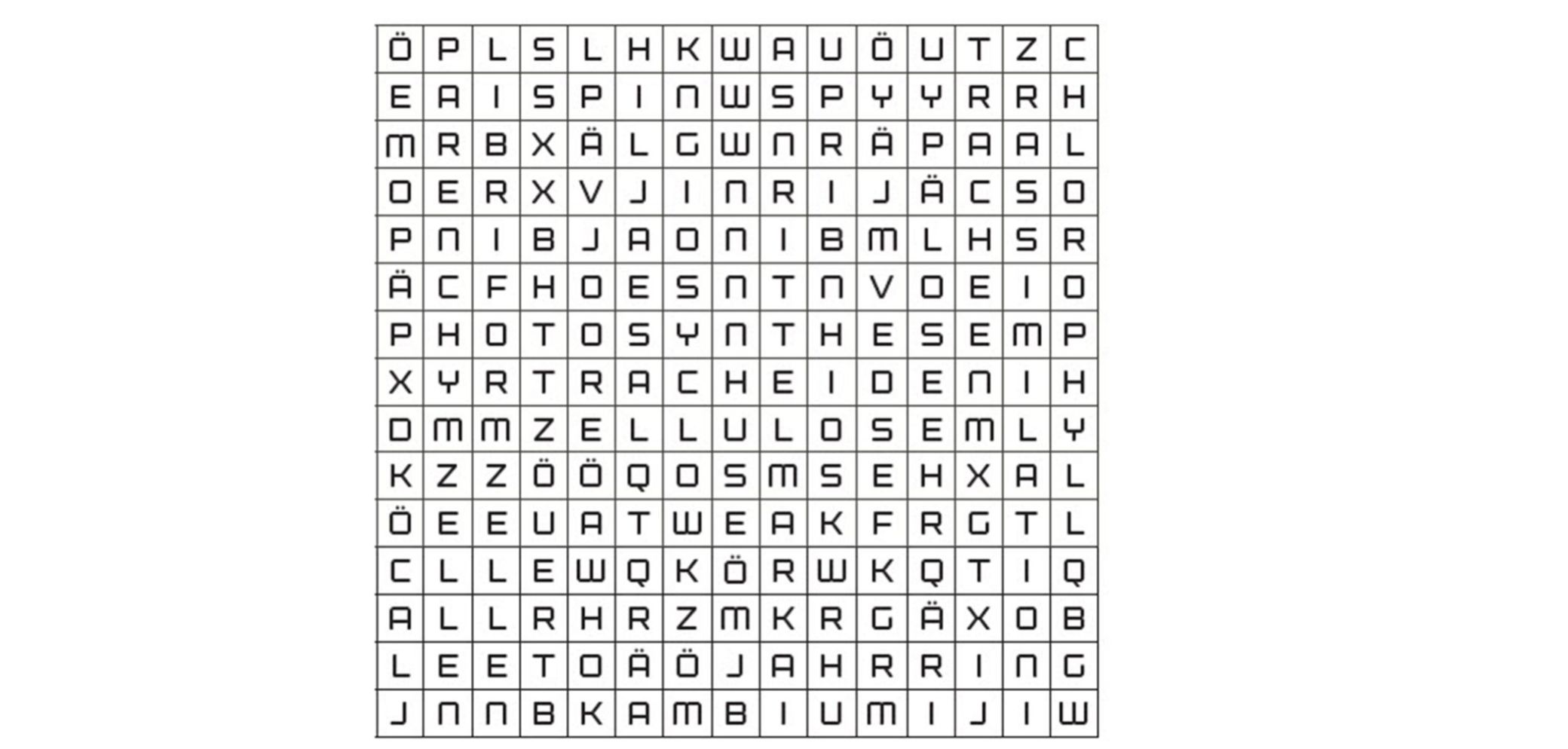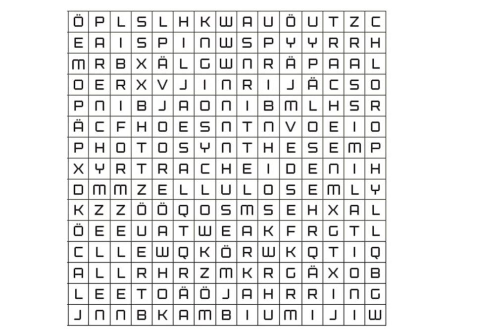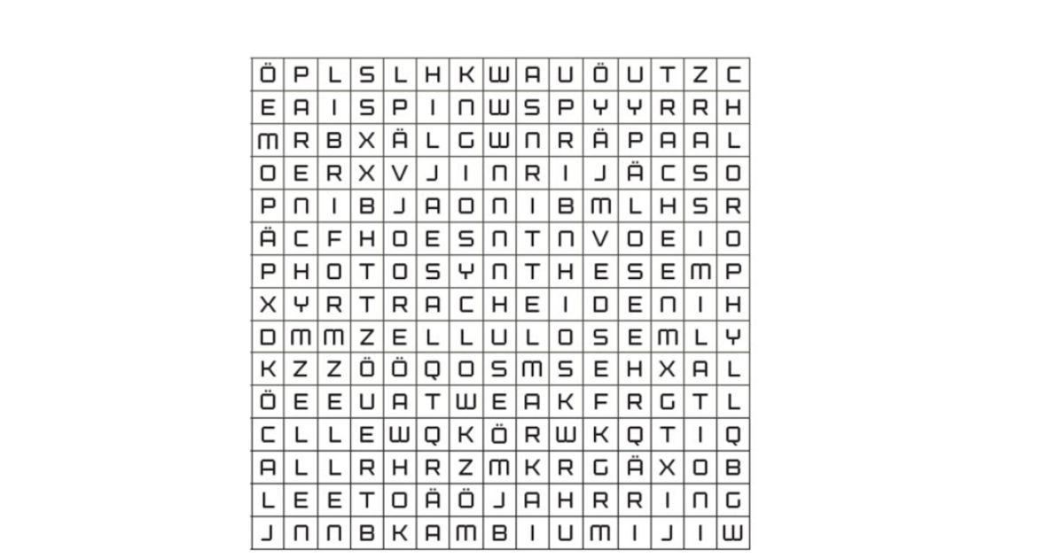 Im oberen Buchstaben-Salat haben sich 14 Fachbegriffe zum Thema Baum und Holz versteckt. Die gesuchten Worte können senkrecht, waagrecht oder diagonal angeordnet sein. Welche 14 Begriffe suchen wir? Als Einstieg schenken wir dir ein Wort: Assimilation