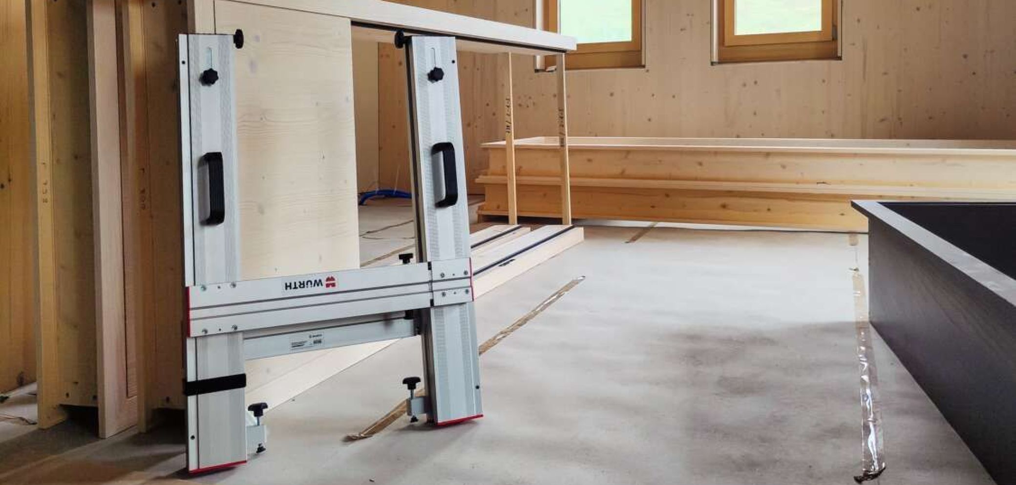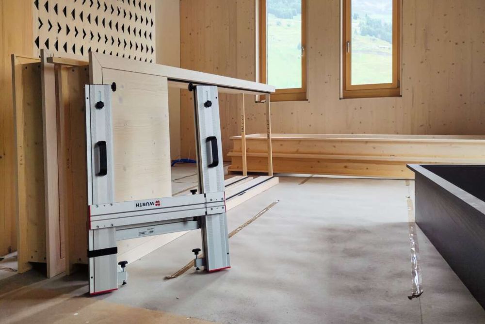Diese Arbeitsschritte können entweder auf der Baustelle geschehen oder bereits in der Werkstatt, denn das Montagewerkzeug von Würth kann auch als Transporthilfe genutzt werden. Die winkelstabile Konstruktion und die beiden Griffe des «Zargenblitzes» vereinfachen das Handling des Türfutters dabei merklich, wie sich im ersten Anwendungsversuch auf der Baustelle in Andermatt zeigte. Denn die zu montierenden, raumhohen Türfutter in massiver Fichte mit rund 2,7 Meter Höhe und festem Türoberteil waren sicher etwas grösser und schwerer als üblich.