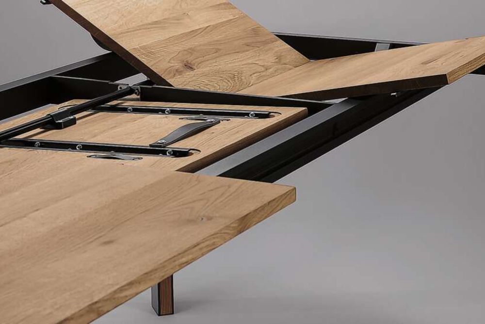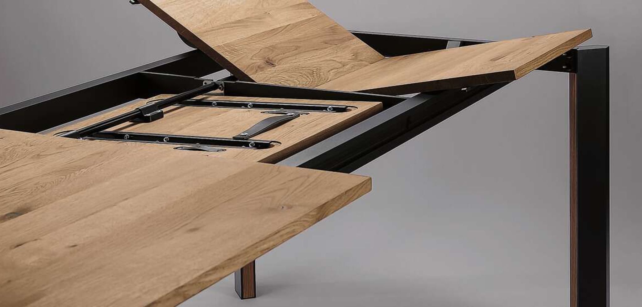 Das Tischsystem «Alu Frontslide Universal 55» von Pöttker ist ein Träger- und Auszugsystem für Tische mit geringer Aufbauhöhe. Die 59 mm hohen Rahmen sind ausgelegt für 115 kg bei einer gleichmässigen Belastung. Es gibt sie eloxiert oder pulverbeschichtet in verschiedenen Farbtönen, und sie sind laut Hersteller mit allen Anbauteilen kombinierbar. Das Auszugsystem ist mit hochwertigen, kugelgelagerten Rollen ausgestattet, die für eine ruhige, gleichbleibende und leichte Laufkultur sorgen. Die Technik wird als sehr widerstandsfähig bezeichnet. Ergänzen lassen sich die Auszüge mit einer Seilbremse zur Fixierung der Auszugslänge und beispielsweise einer flachen Klappmechanik der Firma für die Tischeinlagen. Die empfohlenen Tischlängen im geschlossenen Zustand reichen von 1200 bis 2400 mm. Als Länge der Klappeinlage sind 500, 800 und 1000 mm möglich – bei 500 mm auch zweifach.
