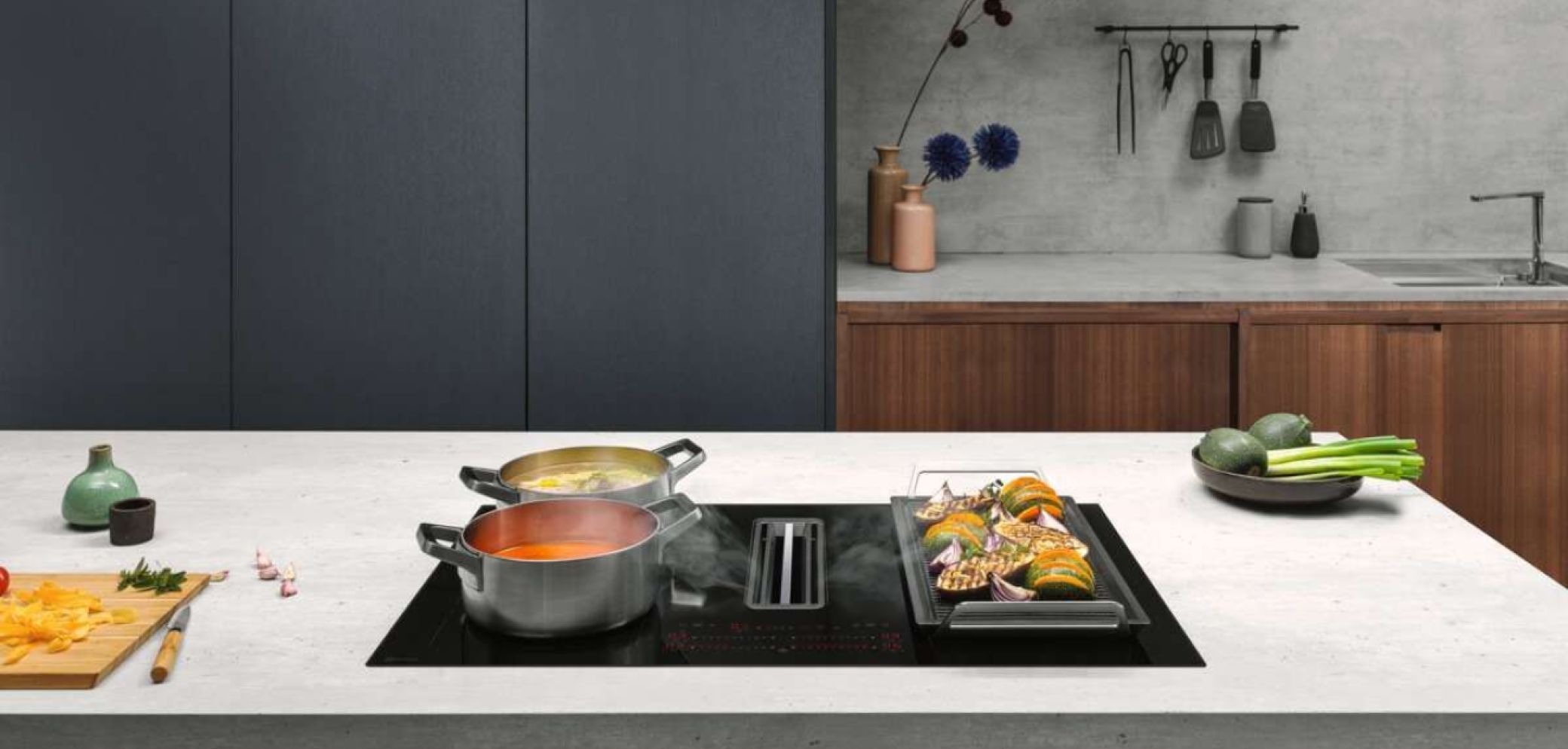Das Induktionskochfeld «Comboflex» mit integriertem Dunstabzug von Electrolux bietet maximale Flexibilität beim Planen der Küche, da dieses auf einer Kochinsel, direkt am Fenster oder auch an der Wand, platziert werden kann. Die beiden Kochzonen links und rechts der leistungsstarken Abzugsmulde sind in vier Bereiche unterteilt. Mit der praktischen FlexiBridge-Funktion lassen sich diese je nach Bedarf zu zwei Zonen unterschiedlicher Grösse oder zu einer grossen Kochfläche verbinden. So findet vom kleinen Kochtopf bis zum Bräter jedes Kochgeschirr seinen Platz. Und dank der direkten Slider-Bedienung lassen sich die einzelnen Kochflächen intuitiv bedienen. Um nach dem Kochen die Raumluft von unangenehmen Gerüchen vollständig zu säubern, wurde die leise «Breeze»-Funktion entwickelt. Auch die Reinigung der beiden Geruchs- und Fettfilter gestaltet sich einfach. Diese lassen sich gut entfernen und können im Geschirrspüler gewaschen und anschliessend im Ofen regeneriert werden. Die Induktionstechnologie verbraucht im Vergleich zu anderen Kochfeldern weniger Strom, und der Dunstabzug gehört der Energieeffizienzklasse A+ an.