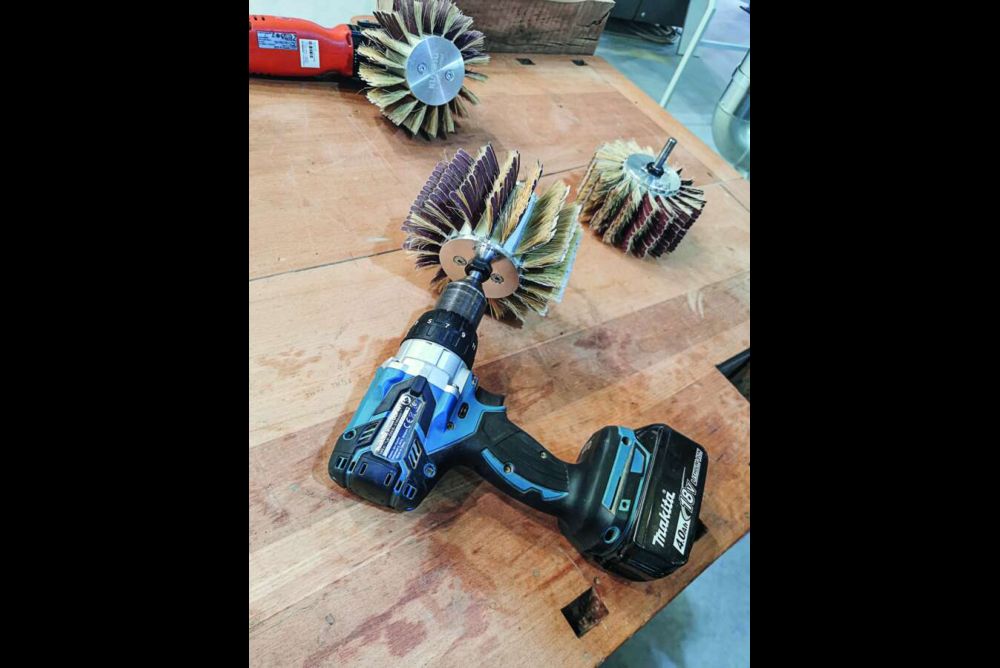 Den Schleifkopf gibt es für die Aufnahme eines Winkelschleifers und mit Dorn für die Anwendung mit Bohrfutter. Die Kombination von Schleifpapier und Bürsten werden auf den Kopf eingeschoben und sind austauschbar. Die Kosten für einen Satz liegen bei rund 40 Fr., der Kopf selbst kostet samt langlebiger Schleifbestückung 240 Fr.