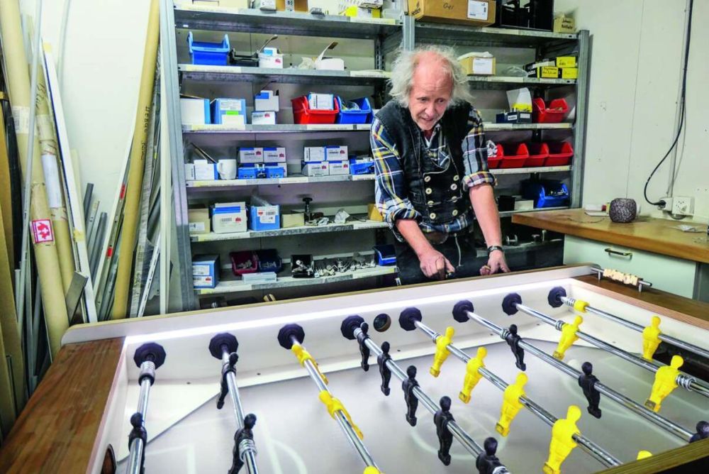 Der Töggelichaschte ist ein zentrales Element in der Schreinerei von Böbu Ehrenzeller (58). Wer verliert, fasst ein Ämtli, wie beispielsweise das Rausbringen des Abfalls. Bild: Monika Hurni