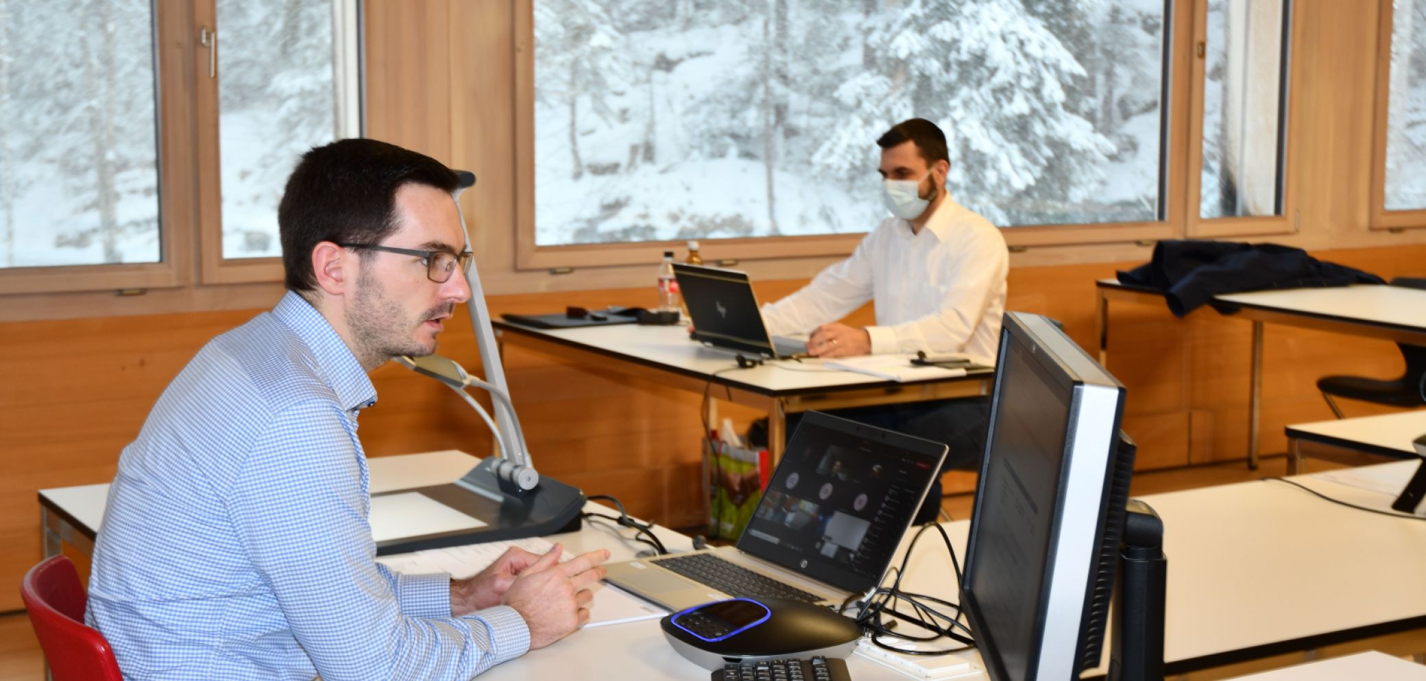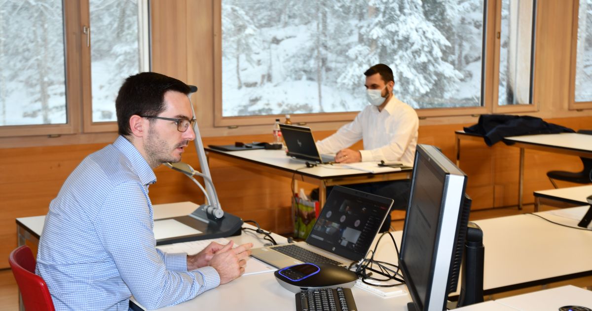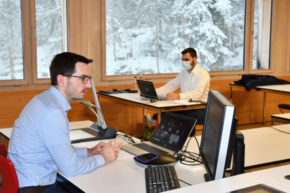 Statt in der Klasse unterrichteten die Referenten Simon Schneider (l.) und Peter Liechti im Januar vor den Monitoren. Bild: Sascha Frey (HFB)