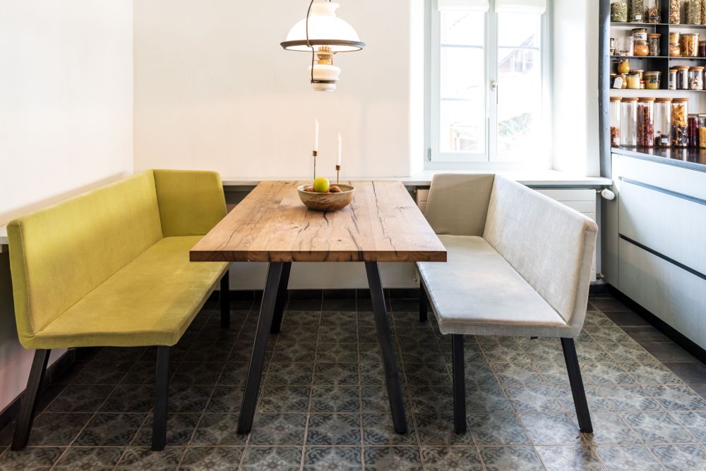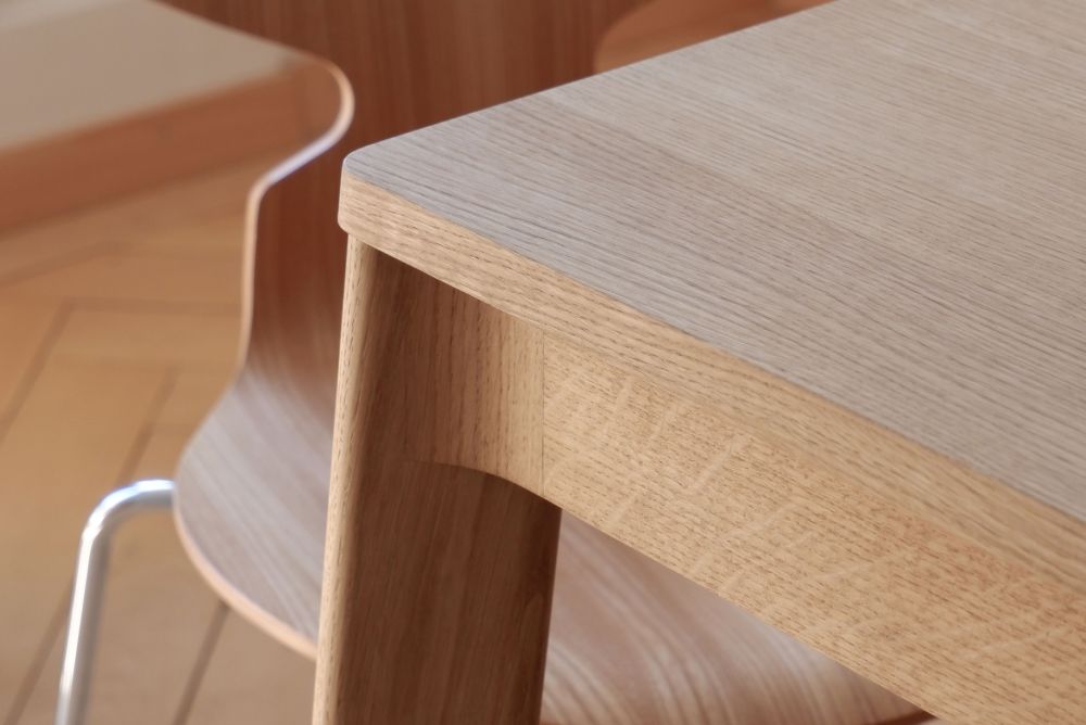 Rutishauser hatte Entwürfe in die Halle 3 der Messe Basel mitgebracht, die – hochwertig verarbeitet – durch besondere Details auffielen. Etwa Tisch und Bank mit schlanken Beinen, deren Verbindungen zum Zargengestell als sanfte Hohlkehle ausgebildet sind, ansonsten aber schlicht und reduziert wirken. «Die Leute bleiben tatsächlich wegen solcher Details stehen. Es ist schön zu sehen, dass so etwas auffällt», erklärt der aus Zürich stammende Möbelgestalter Rutishauser. Rundum hochwertig verarbeitet, weisen auch versteckte Merkmale wie die auf der Unterseite der Tischplatte drehbar gelagerten Falzhölzer auf die Leidenschaft der Beteiligten für handwerklich perfekte Lösungen hin.