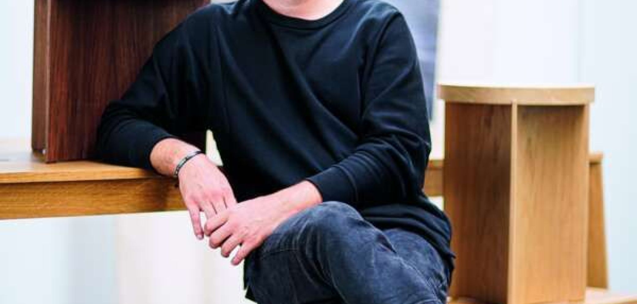 Der gelernte Schreiner und Gestalter Fabio Rutishauser mit preisgekrönten Stücken der Kollektion von Studio Atebo. Bild: Blickfang
