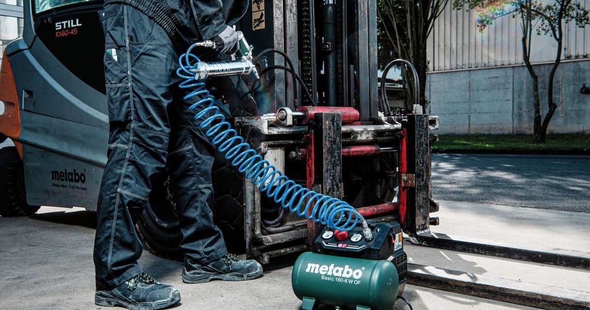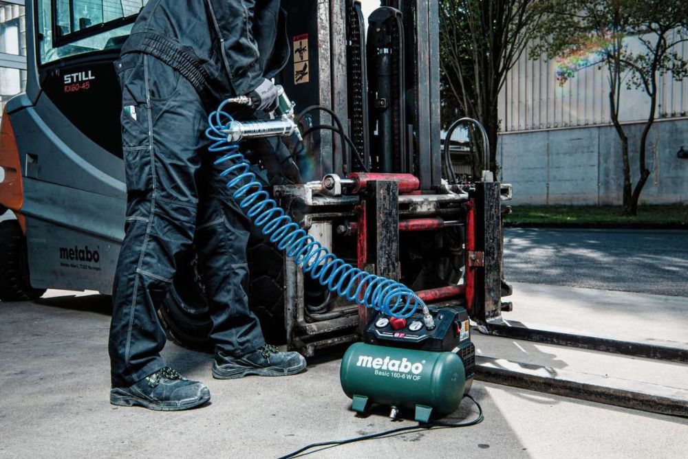 Der ölfreie Kompressor «Basic 160-6 W OF» von Metabo ist mit 8,4 Kilogramm Gewicht und seinen geringen Massen gut zu transportieren. Mit dem einklappbaren Handgriff und der integrierten Kabelaufwicklung lässt er sich überall hin mitnehmen, und sein ölfreier Kolbenverdichter hält den Serviceaufwand gering. Der Kompressor läuft laut Hersteller auch bei Minustemperaturen problemlos an und kann in jeder Lage transportiert und eingesetzt werden.