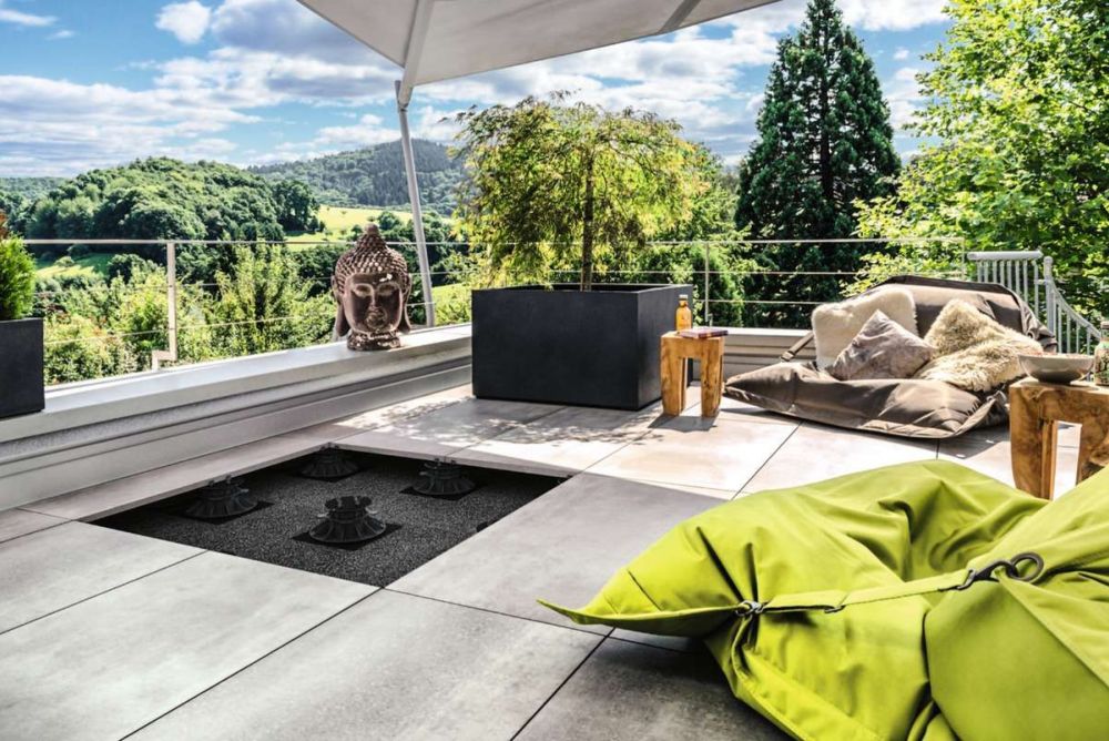 Das Stelz- und Plattenlagersystem «Prostilt» von Proline bietet funktionale Detaillösungen für die häufigsten Gestaltungsformen im Terrassenbau. Herkömmliche Stelzlager sind zwar meistens für die Flächenverlegung geeignet, stossen jedoch im Randbereich der Terrasse schnell an ihre Grenzen. Insbesondere bei Dachterrassen ist der Abschluss des Oberbelags hin zur Abdichtung des Flachdachs ein kritisches Thema. Die integrierten Fugenstege des Stelzlagers sorgen dafür, dass ein gleichmässiges Fugenbild entsteht. Durch die offenen Fugen werden darüber hinaus thermisch bedingte Längenausdehnungen automatisch abgefedert sowie Regenwasser und andere Feuchtigkeit abgeführt. Der Terrassenbelag ist durch die Stelzlagerkonstruktion dauerhaft vom Boden entkoppelt. Dadurch werden Frostschäden vermieden.