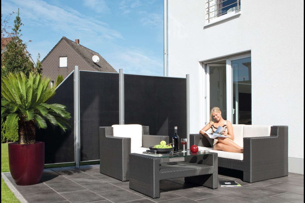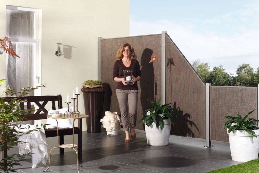 Auf Wunsch können die Elemente jedoch auch in einem sichtbaren Metallrahmen eingepasst werden. Die Elemente sind zu 100 Prozent blickdicht und vor allem für Terrassen geeignet.