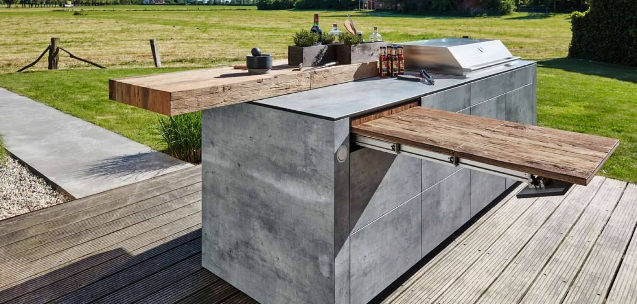 Die Module sind aufgrund ihrer HPL-Oberfläche besonders unempfindlich und leicht zu reinigen. Kundeneigene Grillgeräte verschiedener Grössen und Ausstattungen werden einfach in die Küche integriert. Spüle, Sideburner, Gaskochfeld und Teppanyaki sind nur vier von weiteren individuellen Ergänzungsmöglichkeiten. Ein eingebauter Outdoor-Kühlschrank sorgt zudem für kühle Drinks.