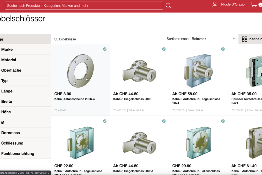 Wer einen bestimmten Artikel sucht, tut dies gleich zuoberst in der Suchleiste – direkt nach Produkt, Marke oder Kategorie. Wer Lust zum Stöbern hat, kann dies über die Kategorien-Reiter Türtechnik, Möbeltechnik, Fenstertechnik, Befestigungstechnik, Chemisch-Technisch, Maschinen/Werkzeuge sowie Betriebsazsstattung/Facitily machen. Fährt man mit der Maus auf eine Kategorie, blenden sich sofort die Unterkategorien ein. Hat man sich für ein Produkt entschieden, werden alle Details eingeblendet. Neben den verschiedenen Grössen und Preisen werden einem zudem das nötige sowie optionale Zubehör vorgeschlagen. Es ist alles übersichtlich und benutzerfreundlich aufgeführt.
