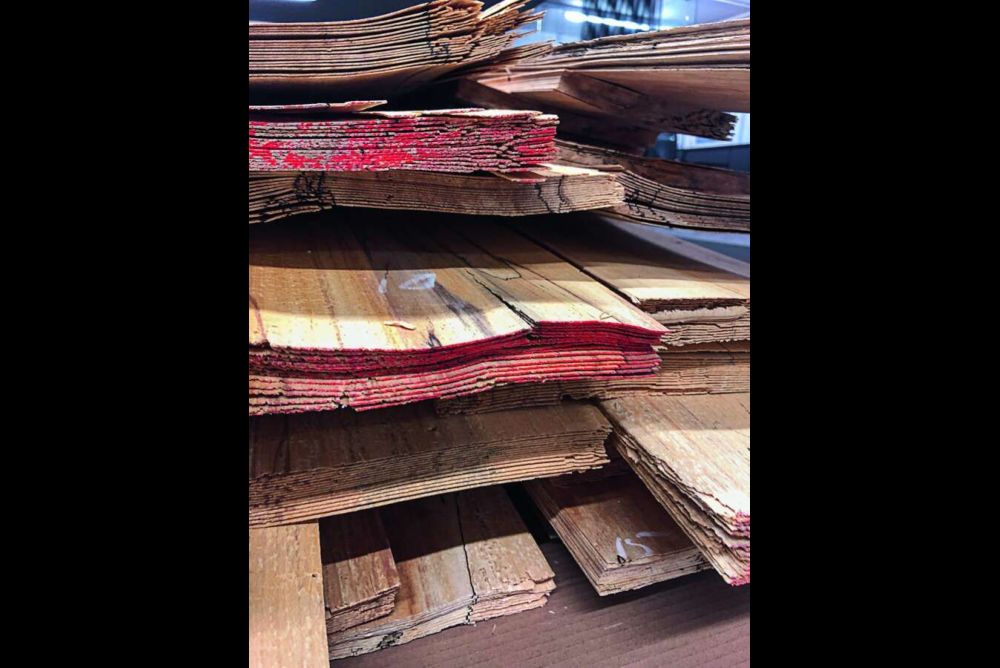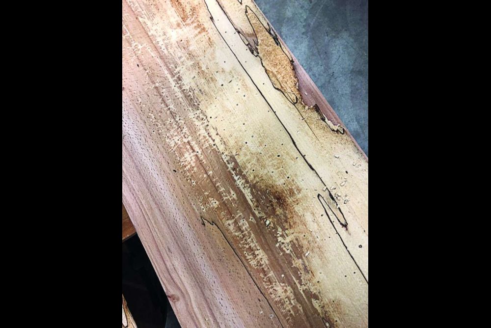 Wenn sich der Schreiner für ein solches Furnier entscheidet, sollte er bei der Verarbeitung ein paar Punkte beachten. Wie immer, wenn man mit exotischen oder besonderen Hölzern arbeitet, sollte eine Maske getragen und die Absaugung angeschaltet werden. «Es ist wissenschaftlich nicht belegt, aber wir empfehlen immer Schutzmassnahmen, da es sich um Pilzsporen handelt», sagt Fiedler. Auch bei der Verarbeitung muss sehr vorsichtig gearbeitet werden. «Das Furnier ist teilweise brüchig, und es kann zu Leimdurchschlag kommen», sagt Scherg. Weil sich neben den Pilzsporen meist auch noch Insekten im Holz breitgemacht haben, muss das Furnier häufig auch noch gespachtelt werden.