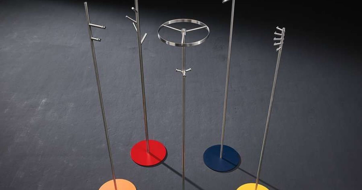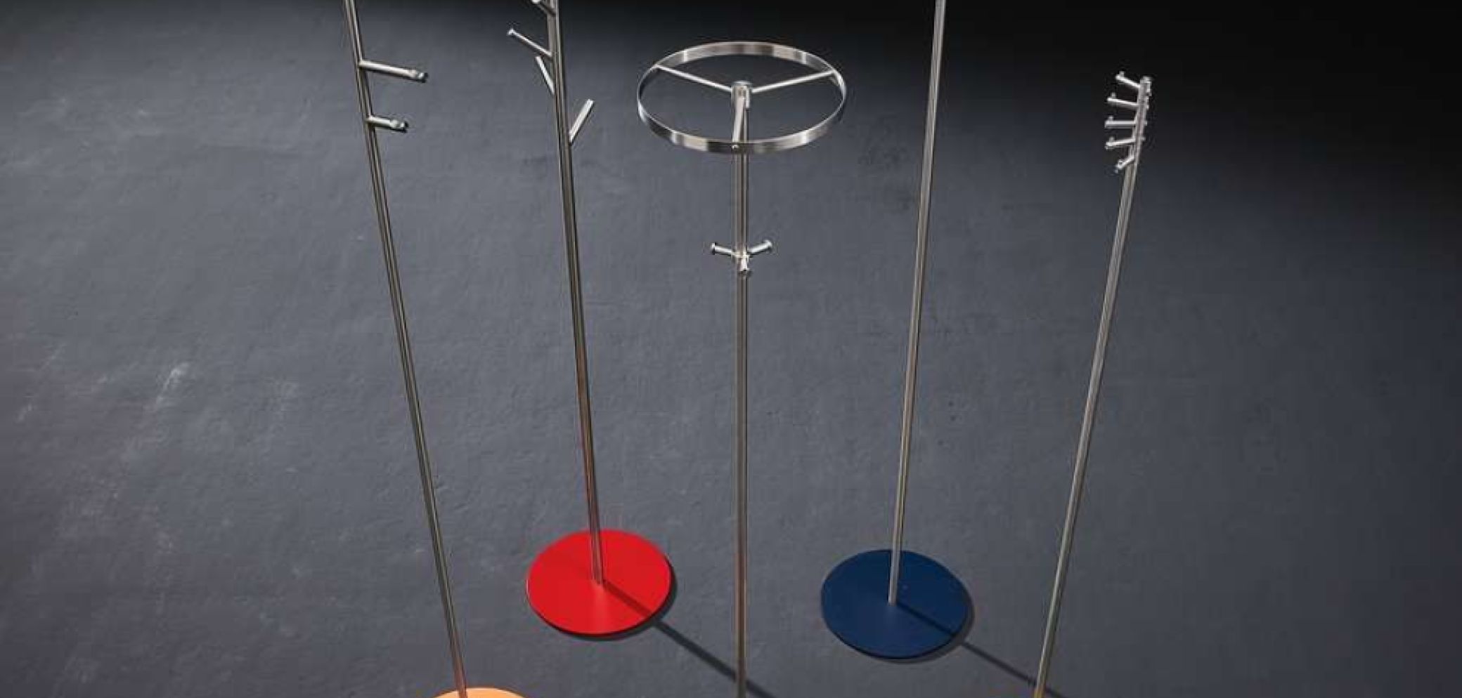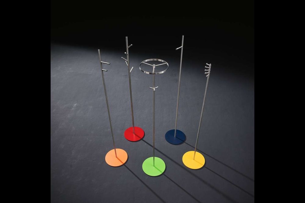 Angelehnt an die Bauhaus-Farben bietet Phos Design ihre Edelstahl-Kleiderständer und -Garderobenwagen mit farbigen Bodenplatten an. Diese Platten sind aus Stahl und pulverbeschichtet. Die Standgarderoben sind somit ausser in der Serien-Hausfarbe Grau-Aluminium (RAL 9007) in den Farben Goldgelb (RAL 1004), Reinorange (RAL 2004), Rubinrot (RAL 3003), Stahlblau (RAL 5011) sowie Gelbgrün (RAL 6018) erhältlich. Die Grundplatte aus der Stahlsorte S235JR hat einen Durchmesser von 360 mm und eine matte Feinstruktur. Es ist nachträglich noch möglich, die Standgarderoben mit den farbigen Platten auszustatten.