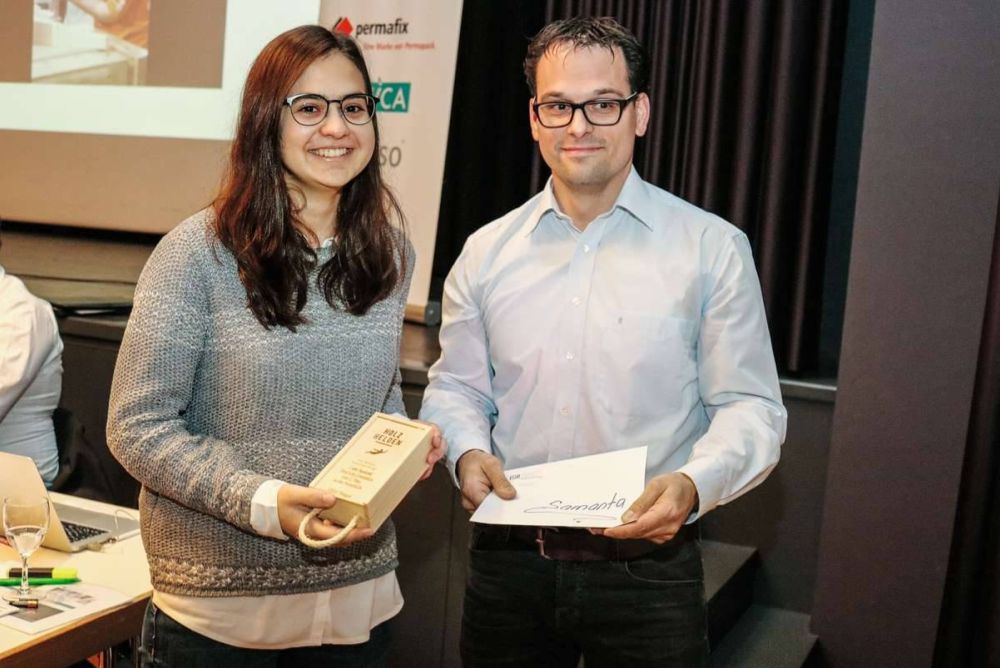 Samanta Kämpf aus Dettighofen ist ganz sicher gerüstet für die Zukunft. Die junge Schreinerin gewann an den Swiss Skills die Silbermedaille und kann nächstes Jahr an den Weltmeisterschaften im russischen Kasan die Schweiz vertreten. Für diese hervorragende Leistung erhielt Samanta Kämpf vom Berufsbildungskommissionmitglied Sascha Berchtold ein Präsent überreicht.