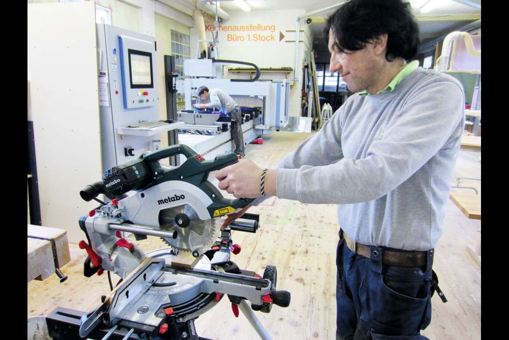 Während der gesamten Testphase befand sich die Maschine auf verschiedenen Baustellen und wurde für das Bodenlegen wie auch für klassische Bauschreinerarbeiten eingesetzt. Dabei ist den Schreinern auch ein Punkt aufgefallen, den man noch verbessern könnte: In der voll herausgezogenen Position habe die Säge seitlich etwas viel Spiel. «Beim Sägen von breiten Teilen macht sich das dann schon bemerkbar», sagt Mario Ebert.
