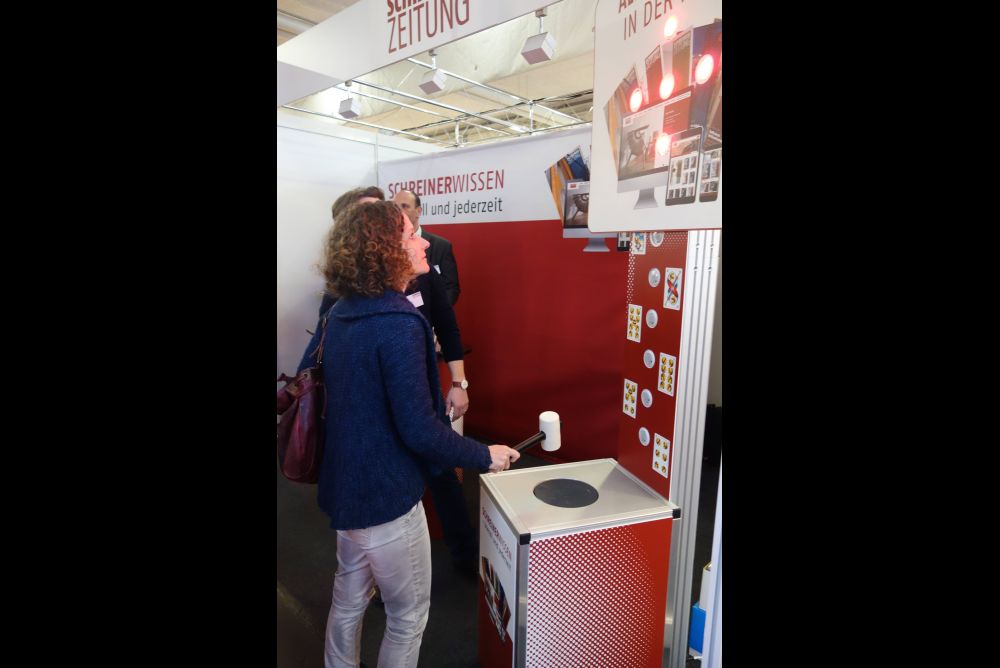 Die SchreinerZeitung war ebenfalls vor Ort und begrüsste die Besucherinnen und Besucher an prominenter Lage gleich Eingangs der Messe. So kam man praktisch nicht darum herum, sein Glück am «Hau-den-Lukas»-Spiel zu versuchten. Daneben verschafften sich viele Leserinnen und Leser Zugang zum neuen ePaper. Die elektronische Ausgabe der SchreinerZeitung wurde positiv von den Kunden aufgenommen. Man freut sich, dass man sich nun immer und überall über das Geschehen der Branche informieren kann.