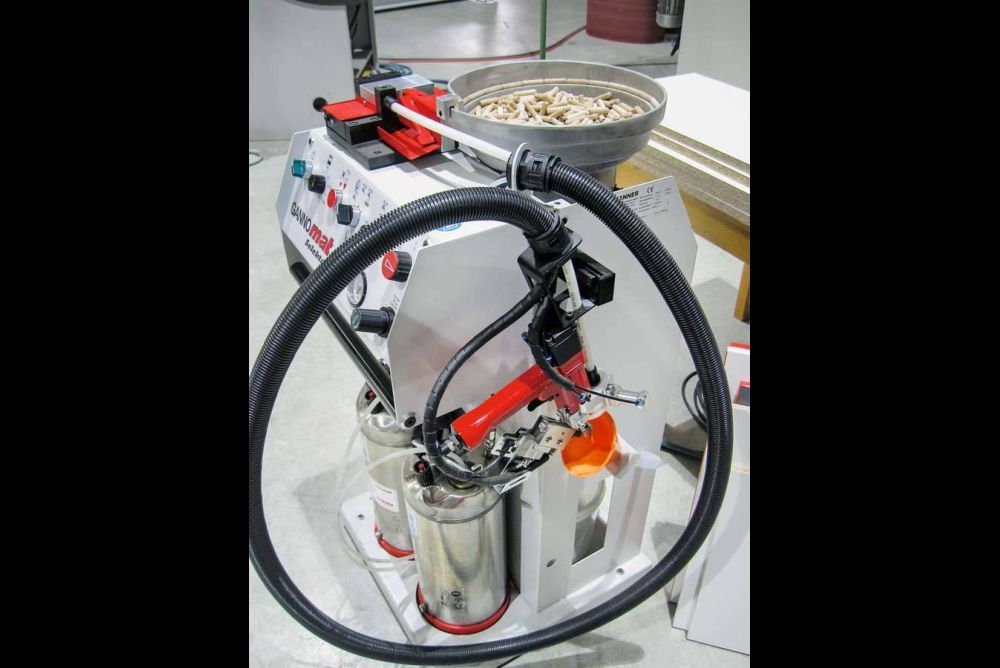 Die Beleim- und Dübeleintreibmaschine «Gannomat Selekta» der österreichischen Erwin Ganner GmbH ersetzt Leimflasche und Hammer. Mit rückschlagsfreier Pistole fasst sie die beiden Arbeitsschritte Leimen und Dübeleintreiben zu einem zusammen. Dank korrekter Leimmenge entfällt zudem das nachträgliche Reinigen der Werkstücke. Positioniert in der Nähe des CNC-Bearbeitungszentrums, der Dübellochbohrmaschine oder der Korpuspresse beziehungsweise des Korpusmontagebereichs, ist mit dieser Maschine ein rationeller Arbeitsablauf möglich.