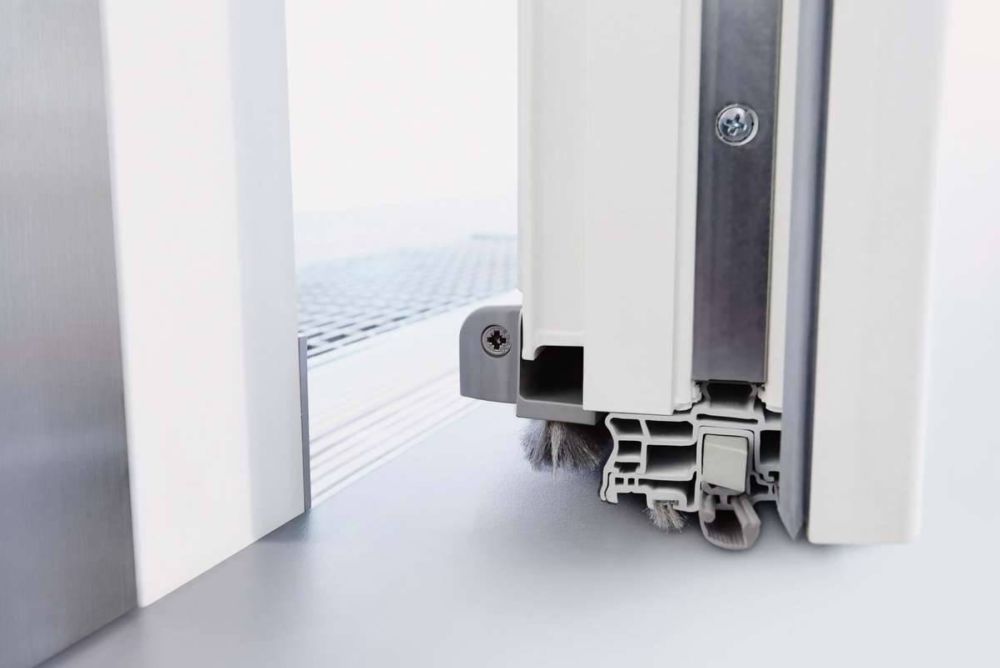 Von der Roto Frank Schweiz GmbH in Dietikon ZH gibt es die Bodentürdichtung «Texel», die auf eine Euronut von 16 Millimetern bei einer Achslage von 13 Millimetern ausgelegt ist. Damit zeichnet sie sich speziell für Fenstertüren aus. Verzichtet man auf die zusätzliche Aufdoppelung für den Falzausgleich, bleibt ein niedriges Element mit einer Bürstenaufnahme direkt vor der einstellbaren Absenkdichtung.