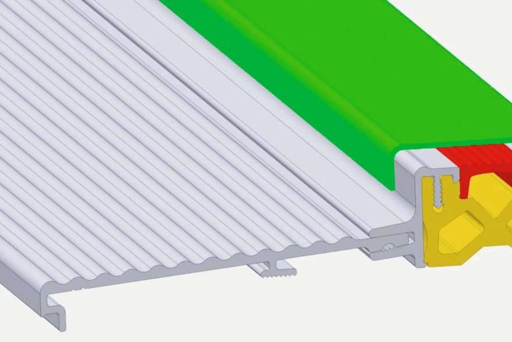Der gleiche Grundkörper, anders bestückt, ergibt eine 20 Millimeter hohe Anschlagschwelle. Aluminiumprofile bilden die Trittkanten, für die Bauphase wird ein Schutzprofil mitgeliefert. Das äussere Rampenblech kann in diversen Tiefen gewählt werden und wird einfach eingesteckt.