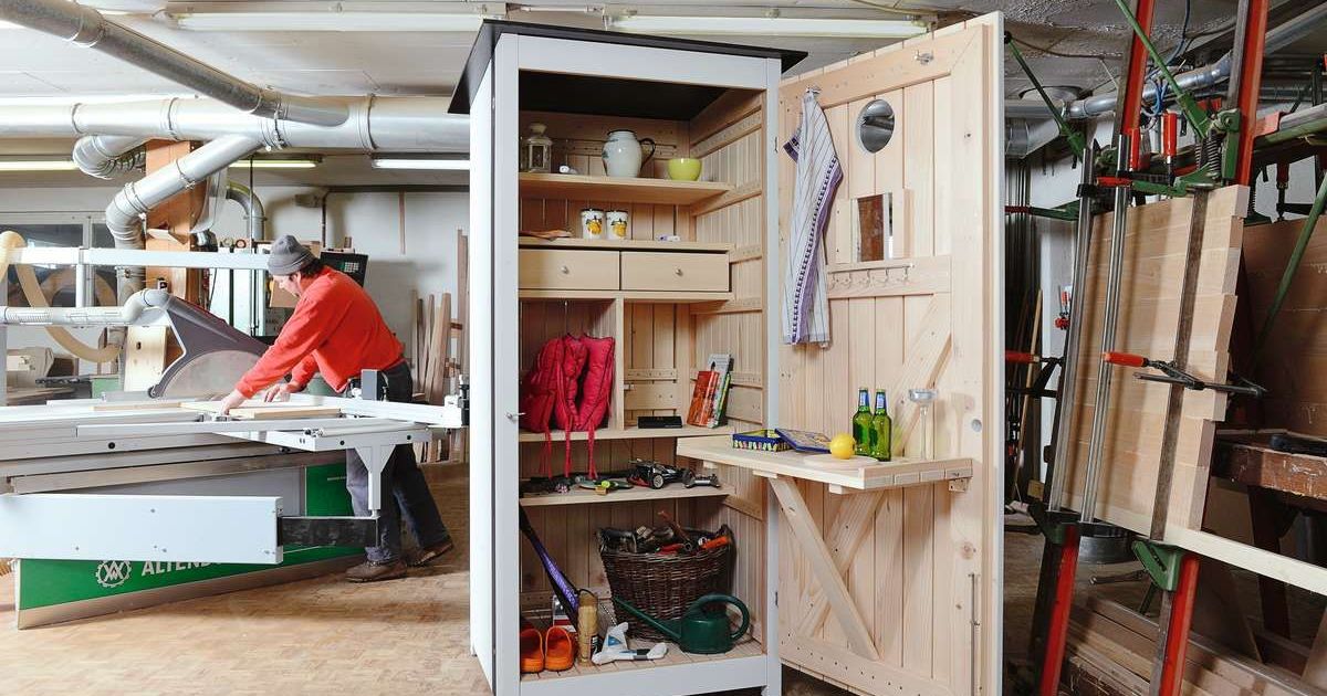 «Die Gartenbox war unser erstes gemeinsames Objekt», erzählt Matthias Eberli. Die Box erinnert vom Aussehen her an ein altes WC-Häuschen, hat aber ein viel sympathischeres Innenleben. Den mobilen, kompakten Schrank gibt es mittlerweile in zehn Ausführungen. Darin lassen sich verschiedene Utensilien für Balkon, Terrasse und Hobby platzsparend verstauen. So gibt es zum Beispiel die Grillbox, in die man den Grill hineinrollen kann, oder eine Spielbox für Kinder, in der sich die Kleinen ein Nest bauen können.