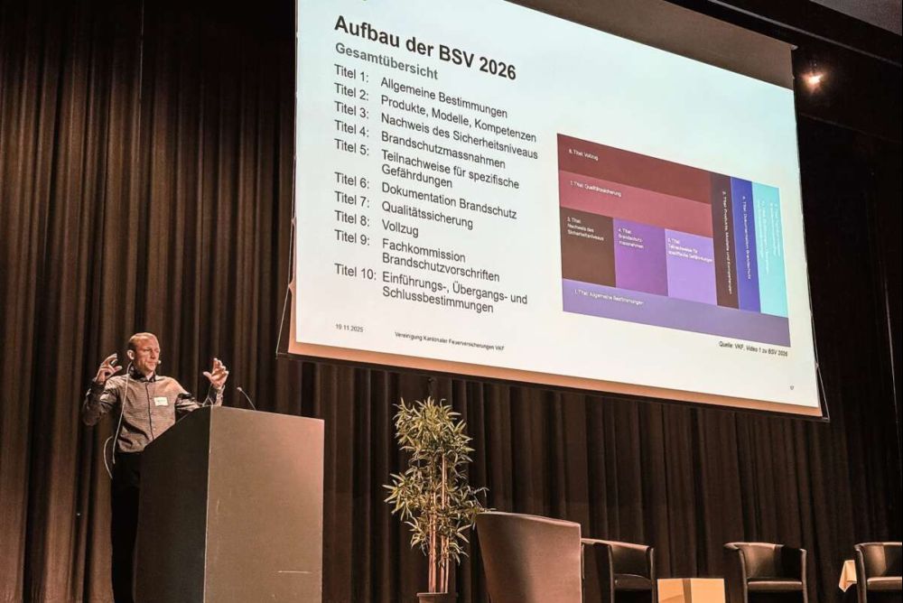 Marcel Donzé, Bereichsleiter Bautechnik VKF, gab in seinem Referat einen Überblick über den Zwischenstand der neuen Brandschutzverordnung (BSV 2026). Die neue BSV wurde komplett neu erarbeitet und tritt ab 2027 in Kraft. Ab Anfang Januar 2026 ist sie in der technischen Vernehmlassung. Sie wird alle Brandschutzmassnahmen in der Schweiz vereinheitlichen und vereinfachen. Die BSV ist im interkantonalen Recht angesiedelt und übersteuert somit die kantonale Gesetzgebung. Die Anforderungen an den Brandschutznachweis können über präskriptive, leistungsbasierte und risikobasierte Verfahren bestimmt werden. Die VKF geht auch in Zukunft davon aus, dass die Mehrheit der Brandschutznachweise, rund 80 Prozent, präskriptiv bestimmt werden. Das Brandschutzregister mit rund 6200 Fachfirmen und Produkten bleibt bestehen. Bezüglich Fluchtwegen wird mit der Fluchtzone ein neuer architektonischer Raum geschaffen. So kann in Zukunft ab zwei Fluchtwegen der zweite bis zu 100 Metern anstatt der bisher 50 Meter ausgeführt werden. Die Fluchtzone darf aber auch genutzt, also mit Inventar versehen, werden. Die lichte Öffnungsbreite wurde auf 800 Millimeter verringert, und neu wird zwischen Entriegelung und Türöffnung differenziert. Auch die Rolle der Qualitätssicherung wird in der BSV 2026 über die Phasen Planung, Realisierung und Bewirtschaftung genauer aufgeteilt.
