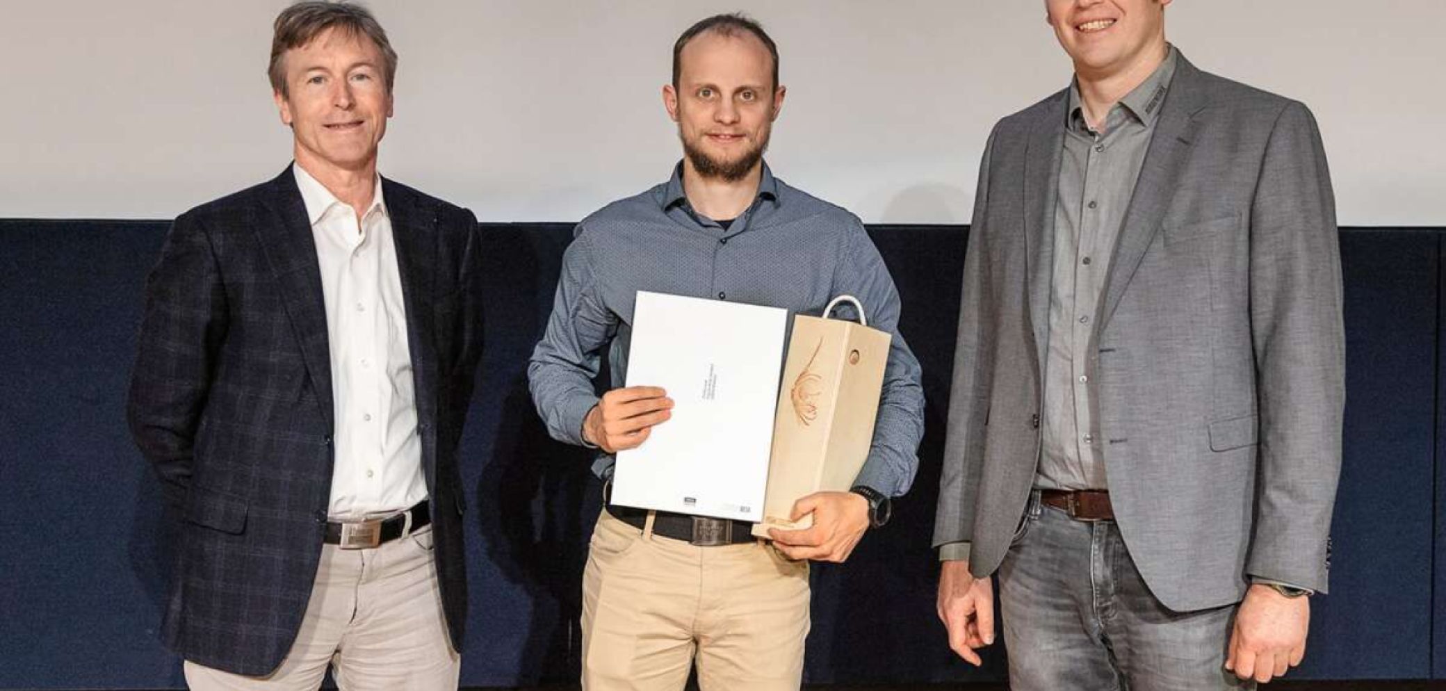 Luca Porta al centro con Luca Pedrotta (a sinistra) e il responsabile di classe Andreas Niederberger della HFB. Immagine: André Burri