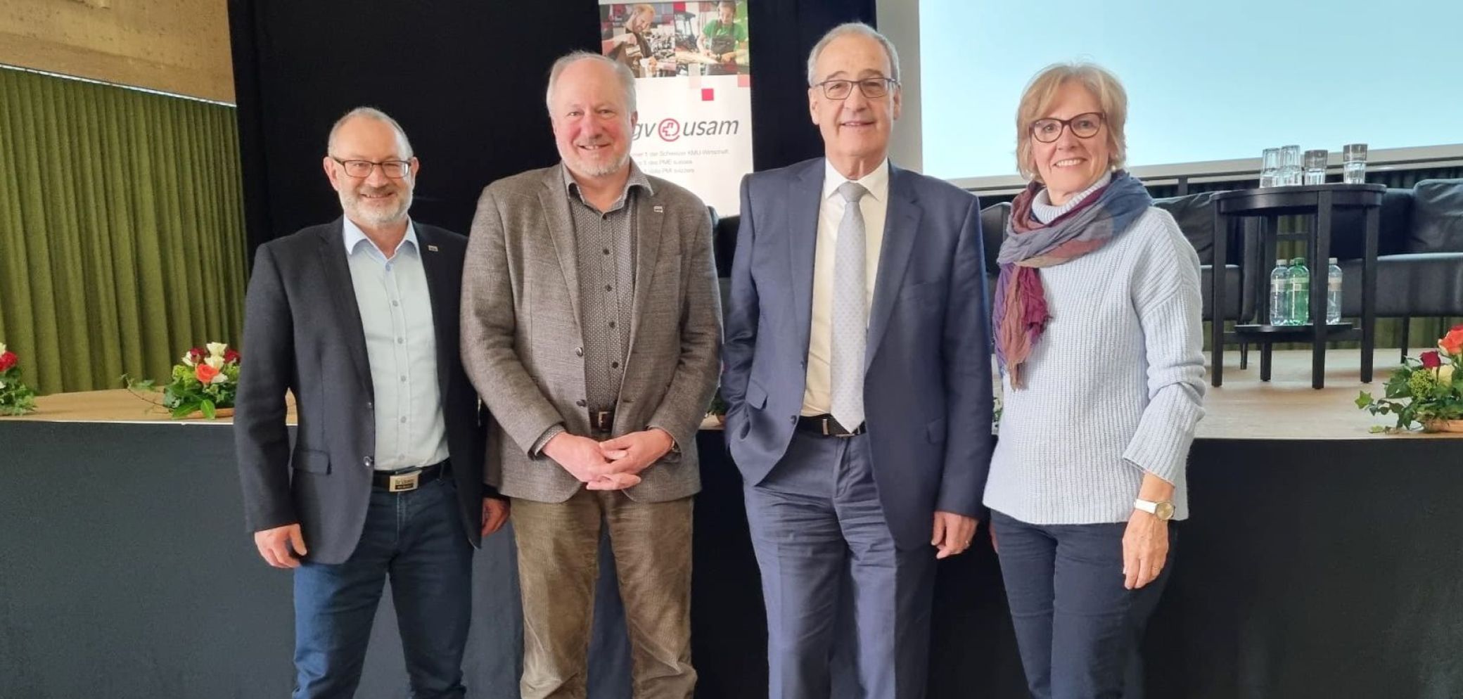 VSSM-Direktor Daniel Furrer (v.l.), Zentralpräsident Thomas Iten und Vizepräsidentin Anita Luginbühl mit Bundesrat Guy Parmelin. Bild: Christoph Schär