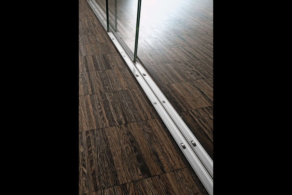 Der Rollenbeschlag «b.1000» von Astec kombiniert Aluminium-Strangguss mit Edelstahlakzenten und eröffnet neue Möglichkeiten der Raumplanung und Raumunterteilung durch dezent sichtbar geführte Glaselemente. Die Besonderheit des Systems besteht in der Lauftechnik. Der Beschlag besteht aus schmalen, flachen Schienen, die sich in den Boden integrieren lassen. Die Schienen enthalten kleine Laufrollen, auf denen die Glasscheiben durch den Raum bewegt werden können. Ein U-Profil dient bei jeder Glasscheibe als Kantenschutz. So wird das Gewicht auch grösserer Glaselemente in den Boden abgeleitet. Das System trägt pro Meter bis zu 300 kg ohne Belastung der Raumdecke und ist für Glasdicken von 8 bis 19 mm einsetzbar. Im Deckenbereich erfolgt die Führung der Glasscheiben über eingelassene Sicherungsschienen. Optional sind diese Schienen mit Dämpfung erhältlich.